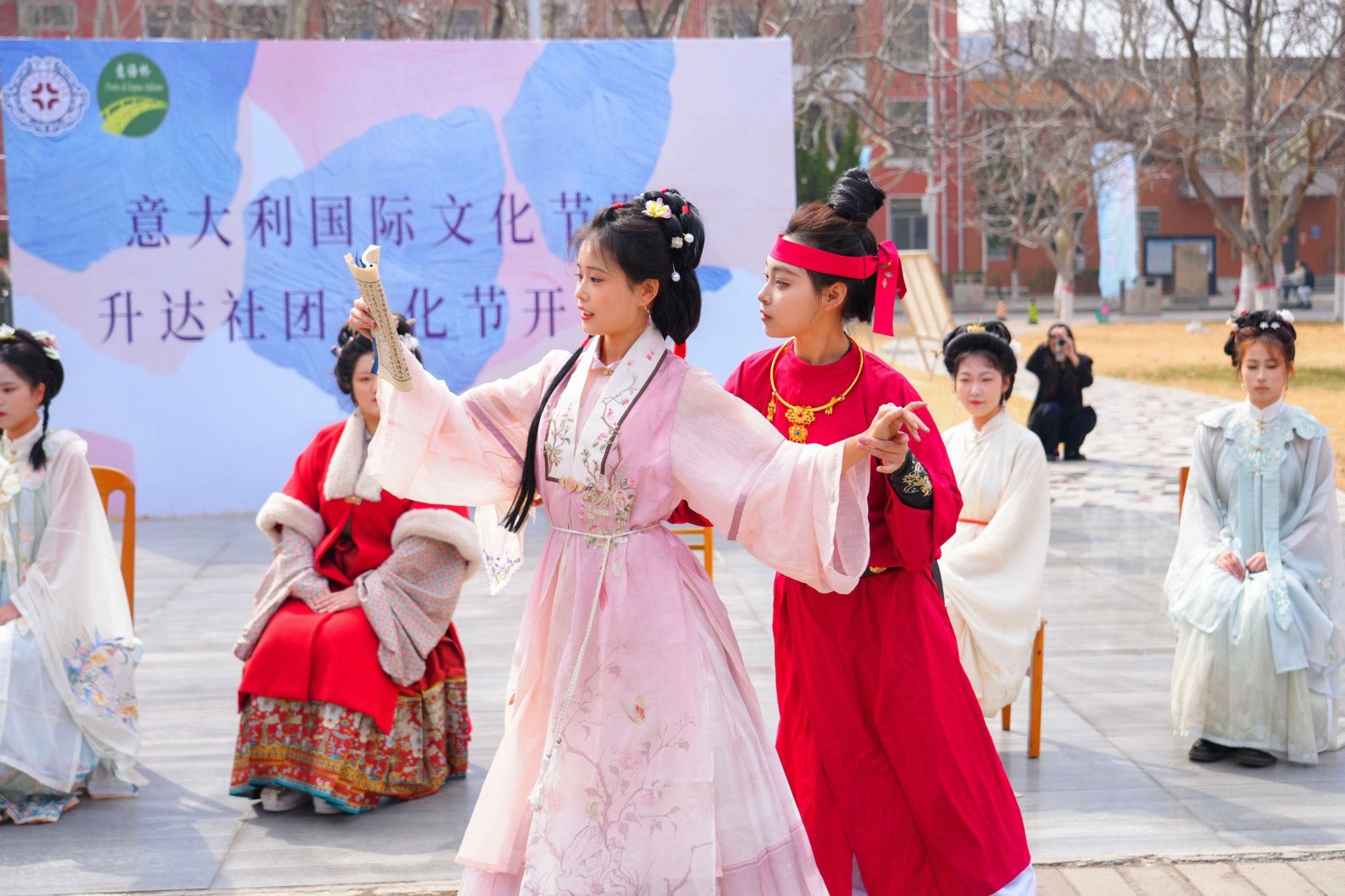 在热烈的掌声中,开幕式进入热场表演环节。艺术学院教师白益萌带来意大利歌曲《你就会看到》(选自歌剧《唐璜》),以悠扬的旋律展现了意大利音乐的独特魅力,让在场观众仿佛置身于浪漫的艺术之都。随后,子衿汉服社带来原创舞台剧《红楼》,将中华优秀传统文化的韵味与独特的艺术表达完美融合,为现场增添了浓厚的文化氛围,中西文化在这一刻激情碰撞。精彩的表演赢得了现场观众的阵阵掌声。