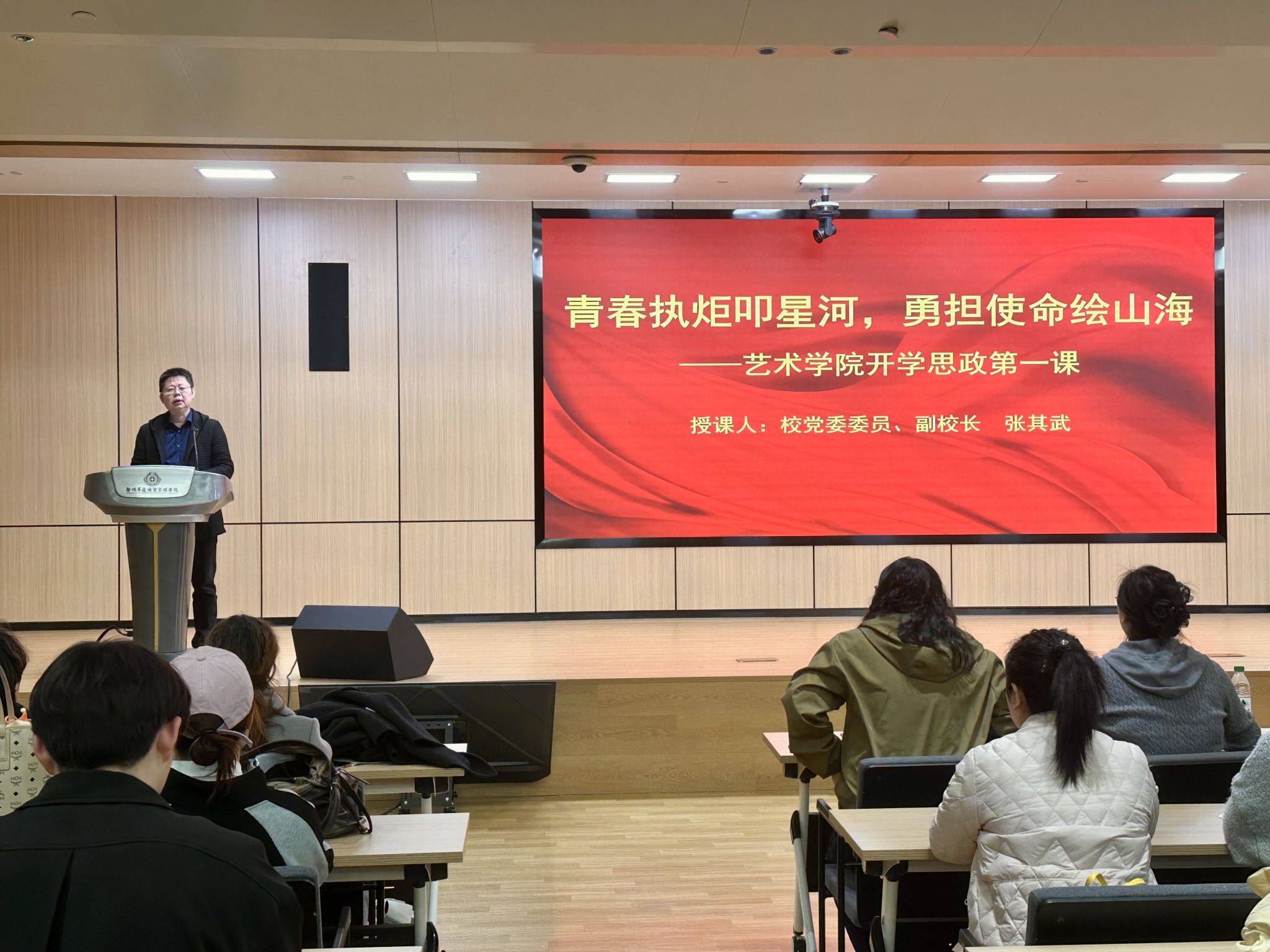 为进一步深化思想政治教育工作,引导师生以昂扬的姿态开启新学期新征程。3月18日下午,学校党委委员、副校长张其武为我校艺术学院师生讲授2025年春季学期“开学思政第一课”,艺术学院党委书记张小雁主持活动。