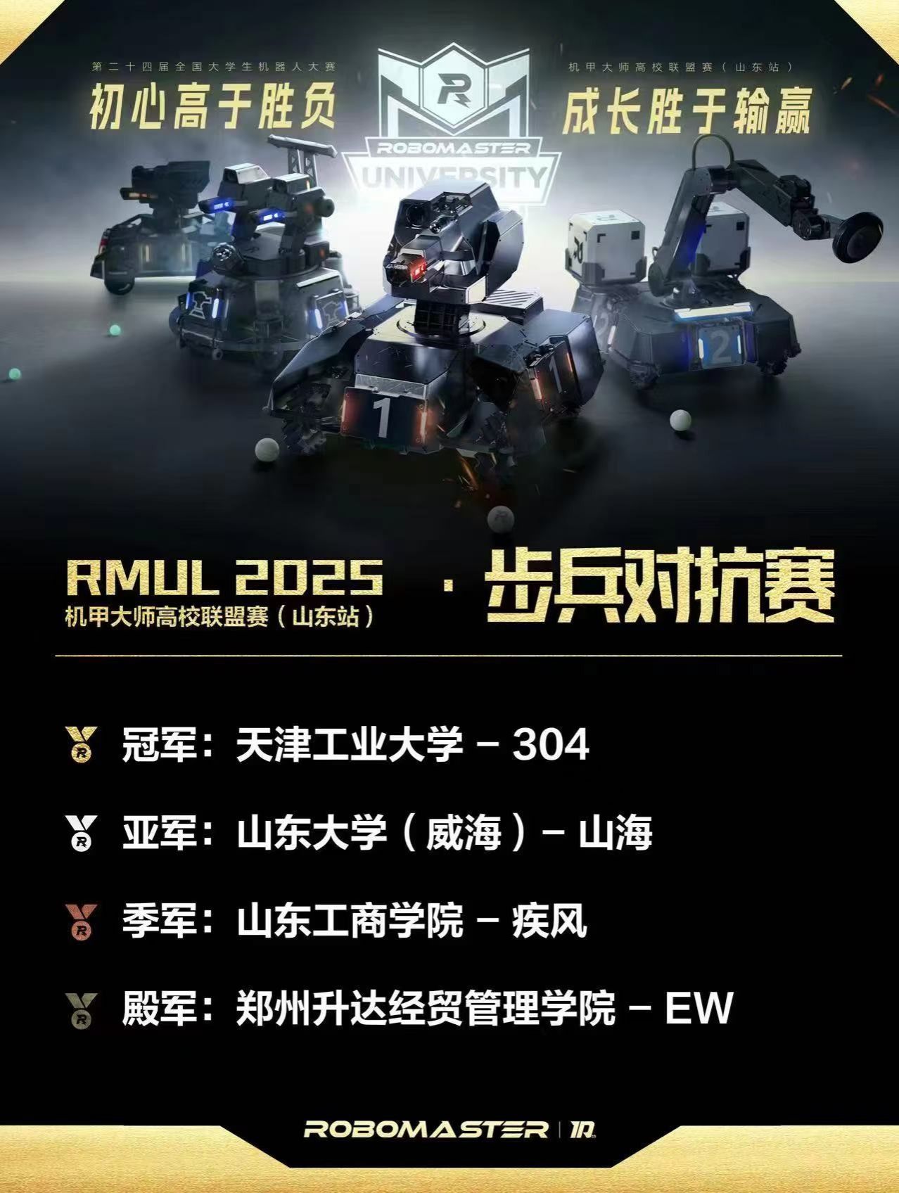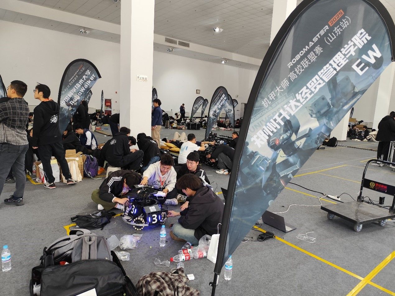 第二十四届全国大学生机器人大赛RoboMaster机甲大师超级对抗赛高校联盟赛(山东站)于2025年3月19日-23日在齐鲁工业大学体育中心举行。受大赛组委会的邀请,我校EW(Evolutionary Wings,进化之翼)战队在指导老师贾超广的带领下,派出张夏、张亚鹏、杨宝全、鲁奇四名队员参加了本次比赛,经过4轮8场的激烈对抗,以5胜1平2负的战绩获得大赛第四名(殿军),为学校赢得了荣誉,我校EW(进化之翼)战队影响力持续快速增长。