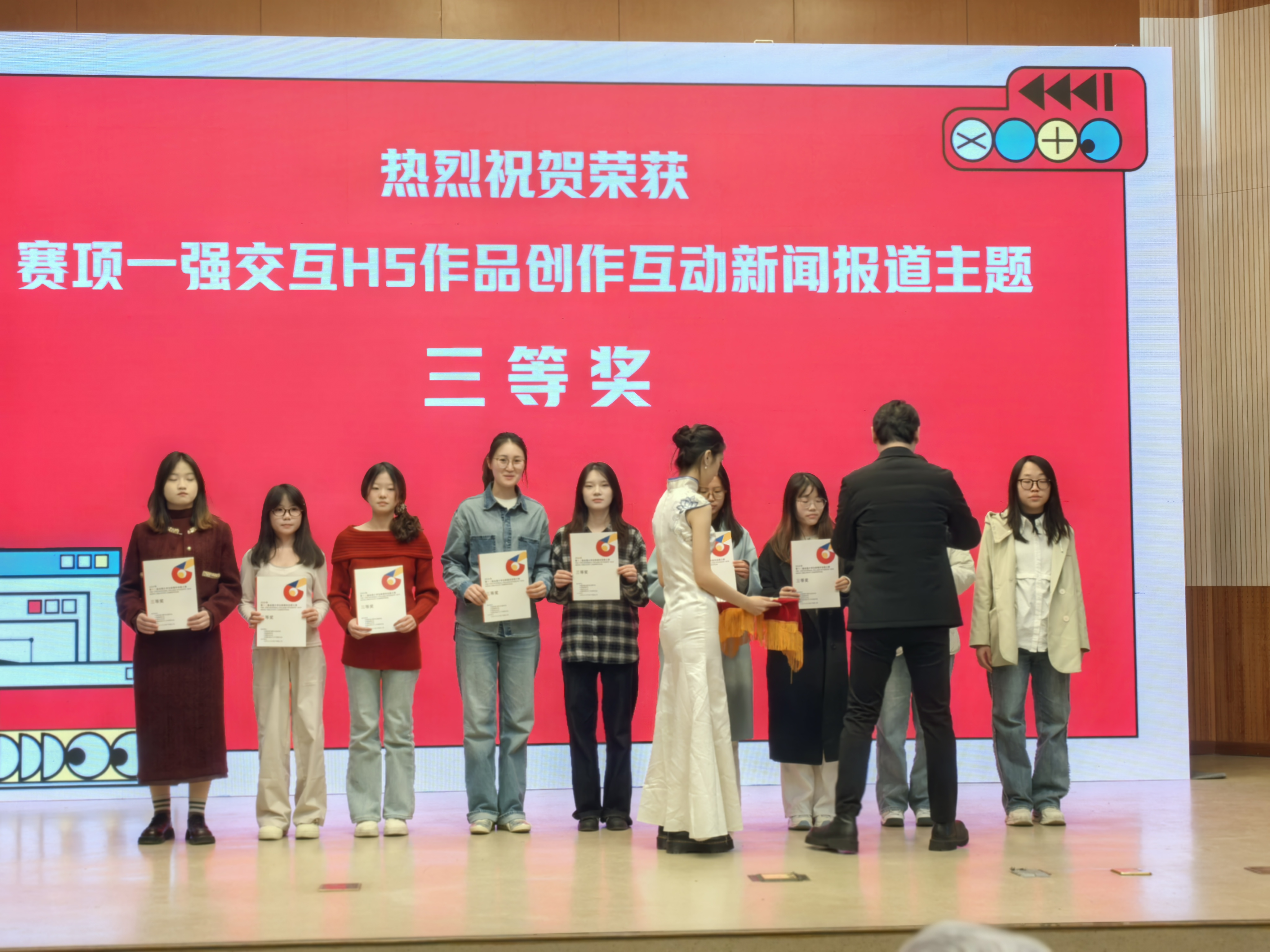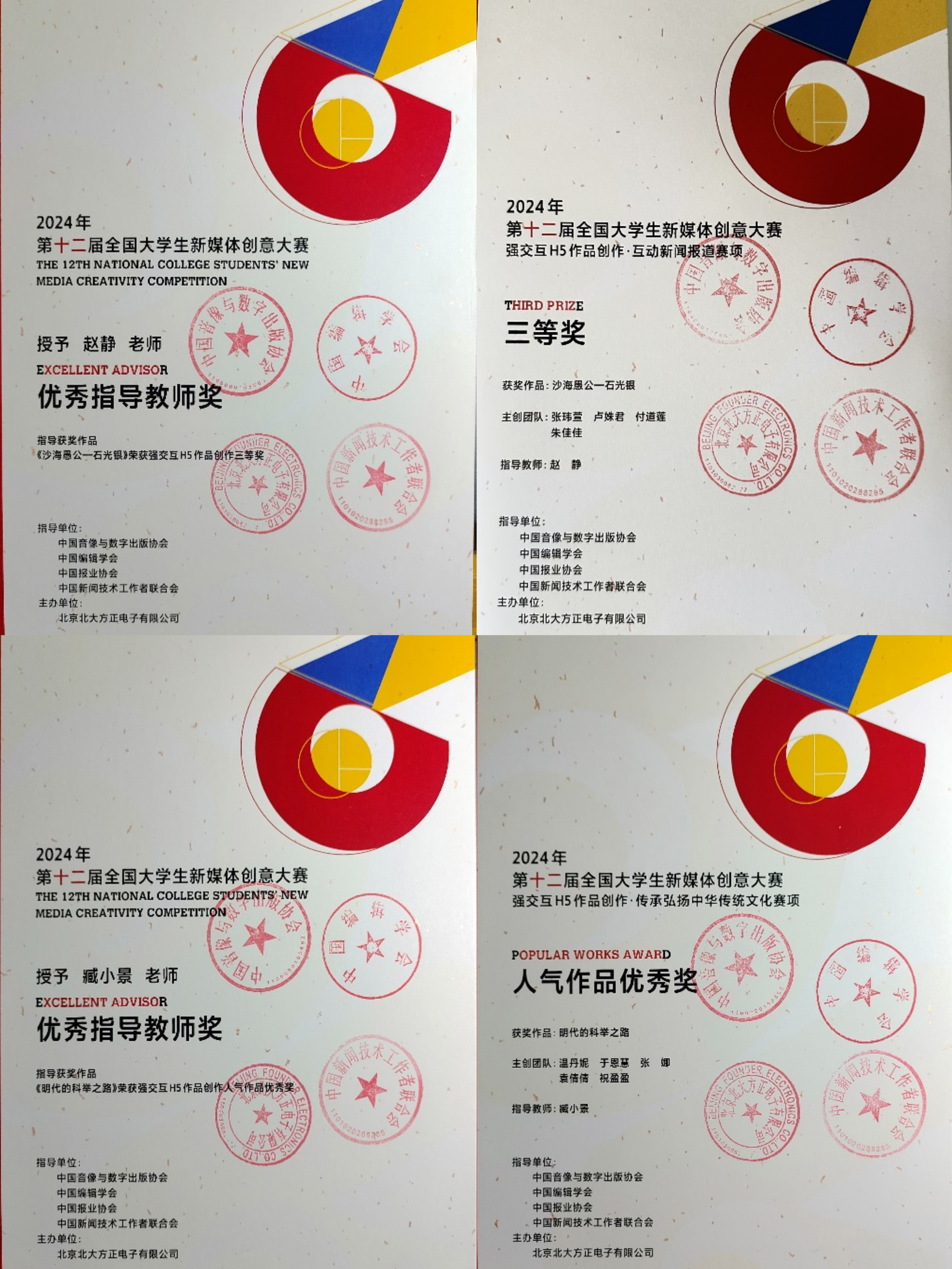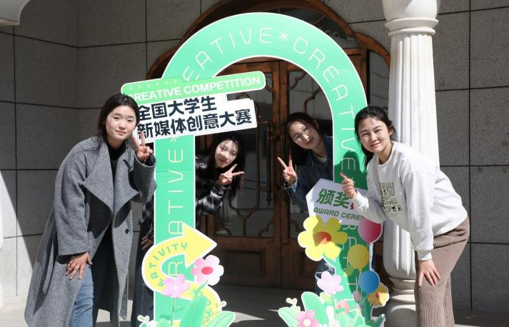 近日,我校文法学院新闻学和网络与新媒体专业师生受邀参加“第十二届全国大学生新媒体创意大赛”颁奖典礼。由2021级新闻学专业学生张玮萱、卢姝君、付道莲、朱佳佳创作的《沙海愚公———石光银》,荣获“强交互H5作品创作”主题中互动新闻报道赛项三等奖;2022级网络与新媒体专业学生于恩慧、张娜、温丹妮、袁倩倩创作的《明代的科举之路》,荣获传承弘扬中华优秀传统文化赛项人气作品优秀奖。赵静、臧小景两位指导老师荣获“优秀指导教师”奖。