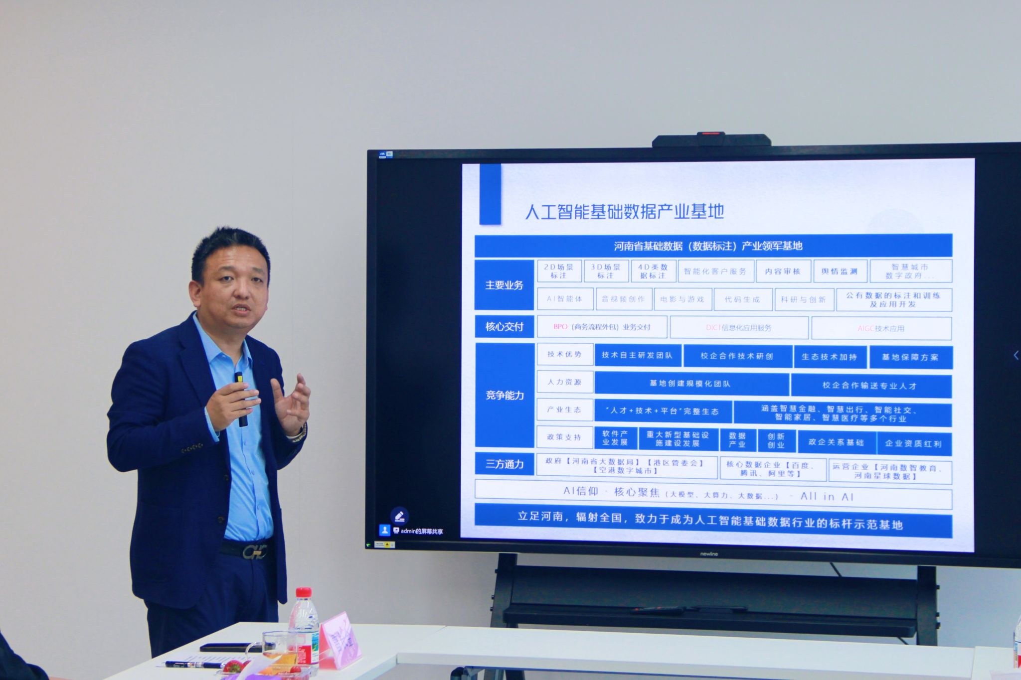 王新奇发表讲话,他充分肯定前期大家在产教融合、校企协同育人方面取得的突出成绩。同时指出此次与郑州升达经贸管理学院与郑州航空港、河南数智教育共建“河南省人工智能基础数据产业基地”,是在我校信息工程学院、管理学院、艺术学院与腾讯、杭州炽橙数字科技有限公司、河南数智教育科技有限公司校企协同育人基础上又一次深度融合的探索,是“政校企”合作的典范,是学校深化产教融合、服务区域经济发展的重要举措。基地的落地,不仅将推动人工智能基础数据的研发与应用,更将为学院师生搭建起“理论教学—技术实践—产业转化”的全链条平台。