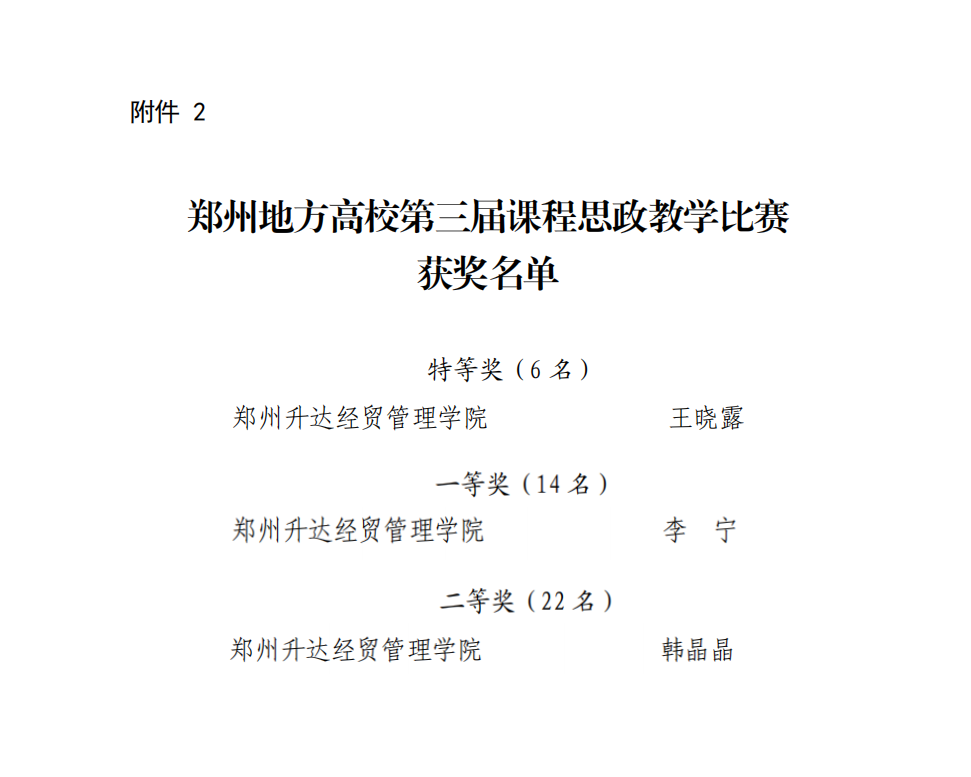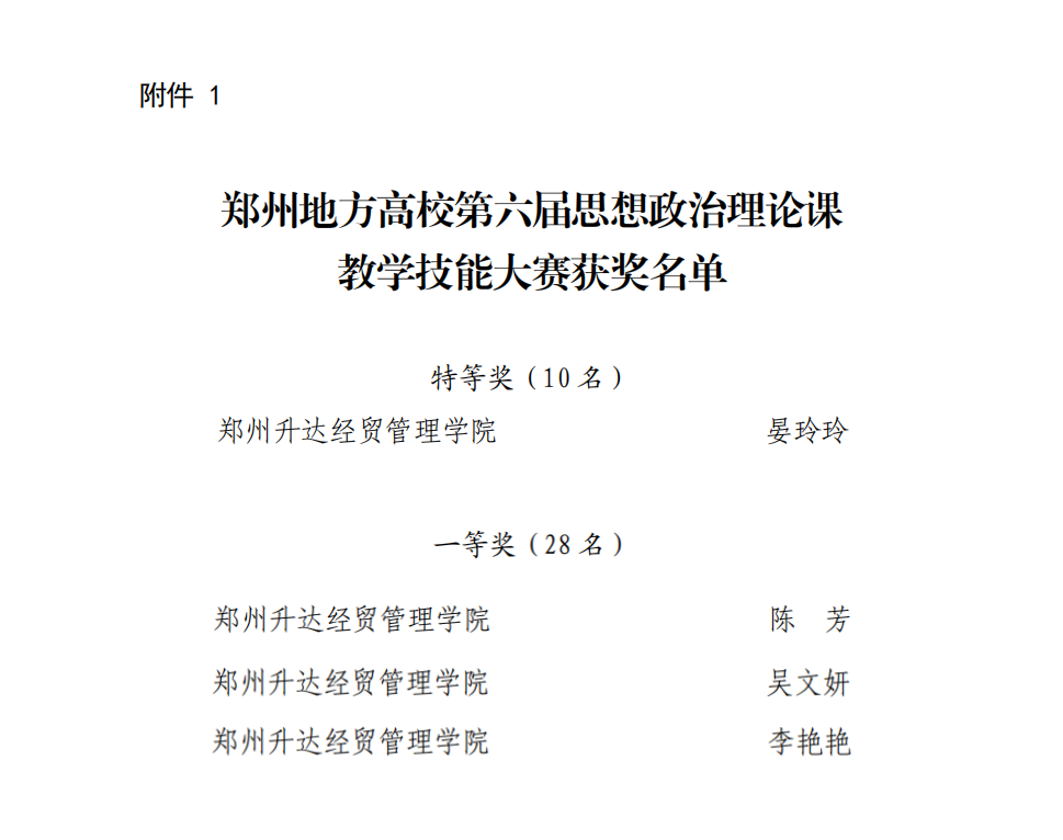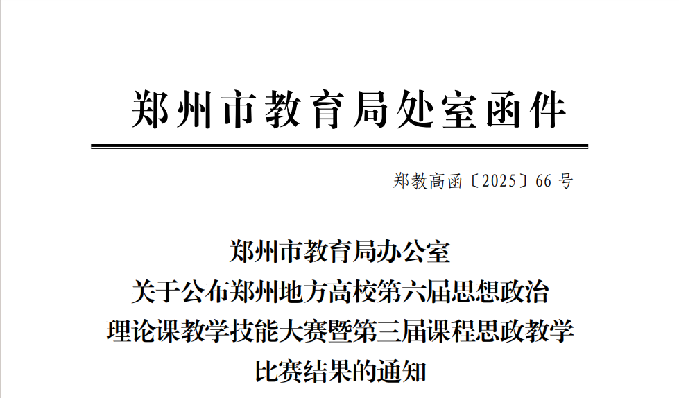 近日,郑州市教育局发布了《关于公布郑州地方高校第六届思想政治理论课教学技能大赛暨第三届课程思政教学比赛结果的通知》(郑教高函〔2025〕66 号)。在郑州地方高校第六届思想政治理论课教学技能大赛中,我校马克思主义学院晏玲玲老师荣获特等奖,陈芳、吴文妍、李艳艳三位老师荣获一等奖。在郑州地方高校第三届课程思政教学比赛中,我校艺术学院王晓露、数学与信息科学学院李宁、建筑工程学院韩晶晶老师分别荣获特等奖、一等奖和二等奖。