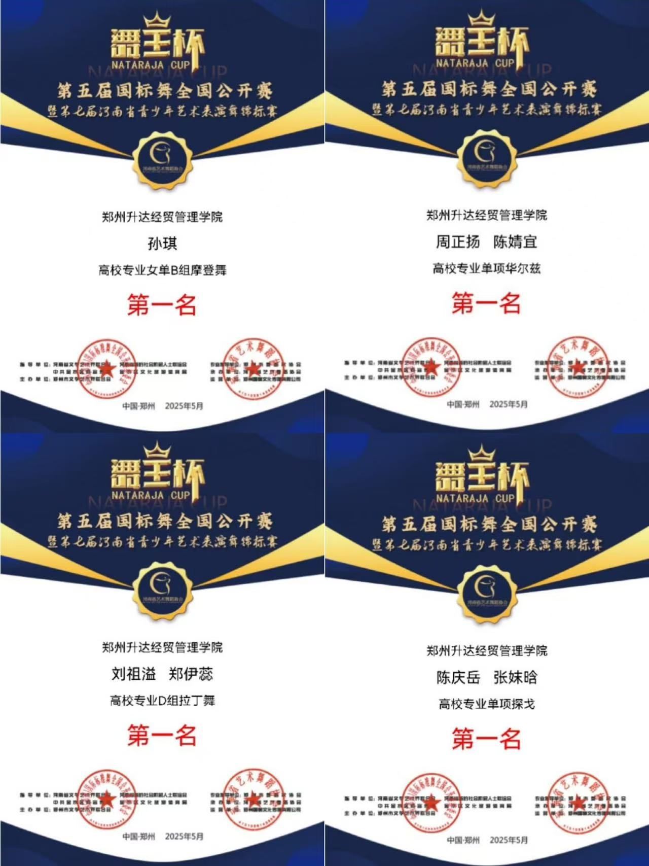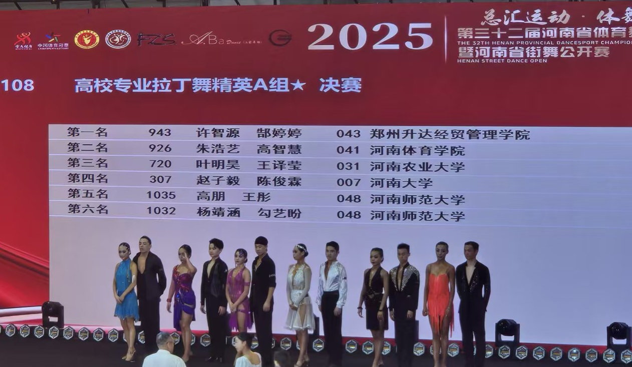 近日,我校体育学院体育舞蹈专业学子参加河南省国际标准舞(体育舞蹈)全国公开赛并取得8项第一名的佳绩。其中许智源、郜婷婷同学获得河南省第三十二届体育舞蹈锦标赛高校专业拉丁舞精英A组第一名,周钰凯、李宜冰等同学在“舞王杯”国际标准舞全国公开赛中获得7项第一名。