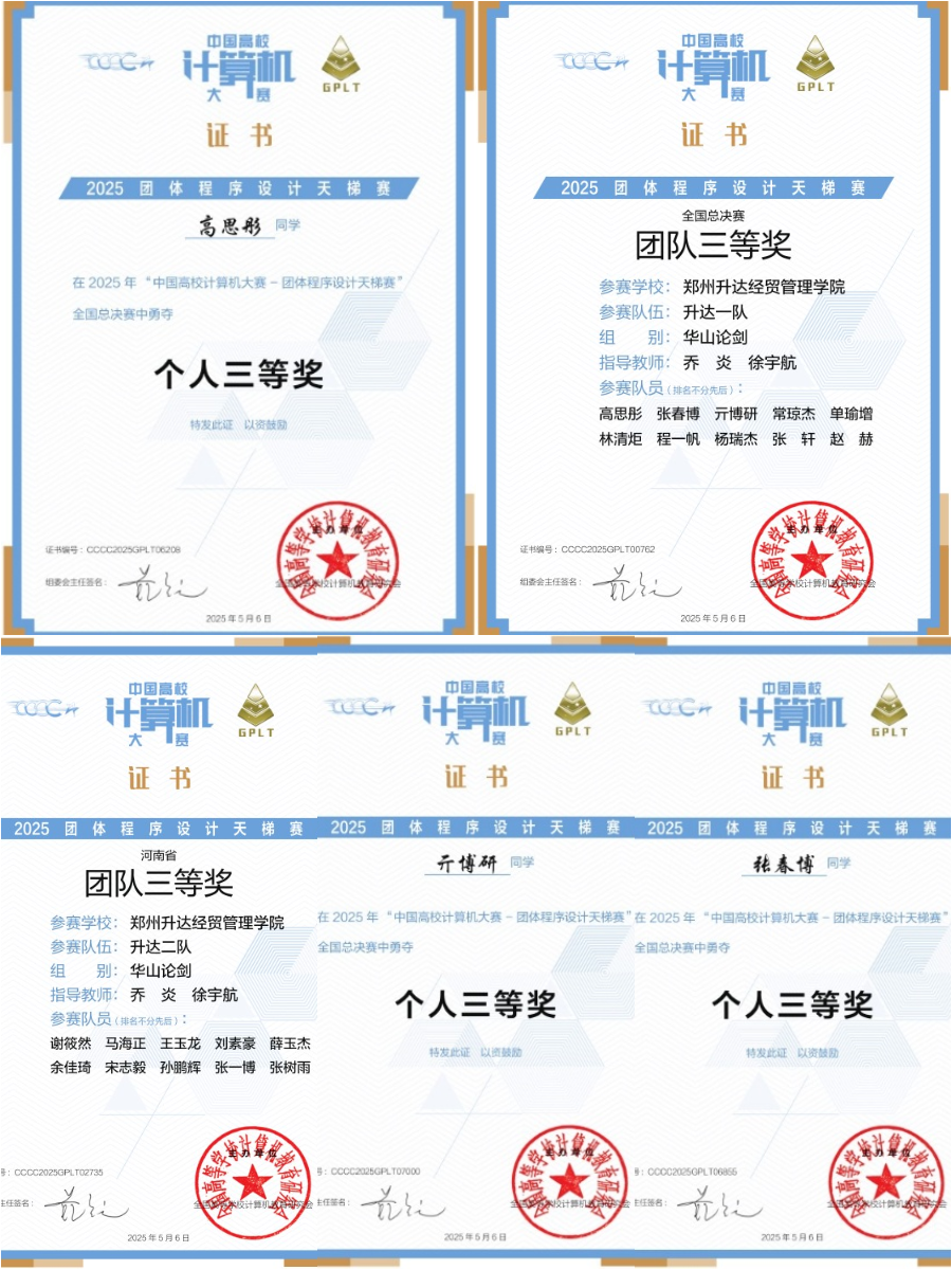 近日,中国高校计算机大赛——团体程序设计天梯赛全国总决赛圆满落幕。我校信息工程学院选派ACM协会中3支队伍共30名学生参赛,最终荣获全国总决赛团队三等奖1项、个人三等奖3项,荣获河南赛区团队三等奖1项。