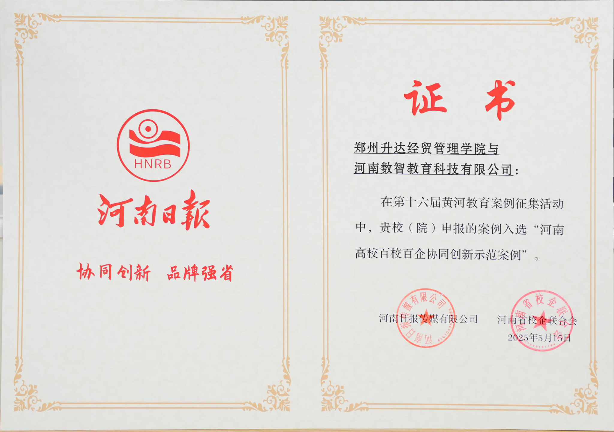 活动上,王新奇被聘任为“黄河教育智库专家”,我校与河南数智教育科技有限公司申报的案例入选“河南高校百校百企协同创新示范案例”。
