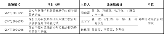 日前,共青团河南省委、河南省社科联公布了《2024年度专项调研课题(青少年工作研究)立项名单》。我校《青少年智能手机依赖现状的心理干预策略研究》等三项课题获批立项。