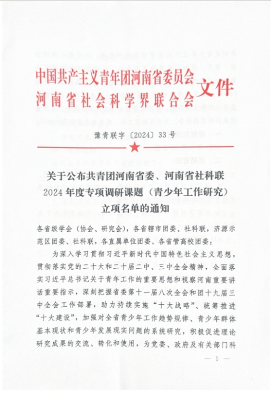 此项研究,是深入学习贯彻习近平新时代中国特色社会主义思想,贯彻落实党的二十大和二十届二中、三中全会精神,全面落实习近平总书记关于青年工作的重要思想和视察河南重要讲话重要指示的生动实践。请立项负责人根据立项课题,坚持问题导向,深入实际调研,高质量完成课题报告。
