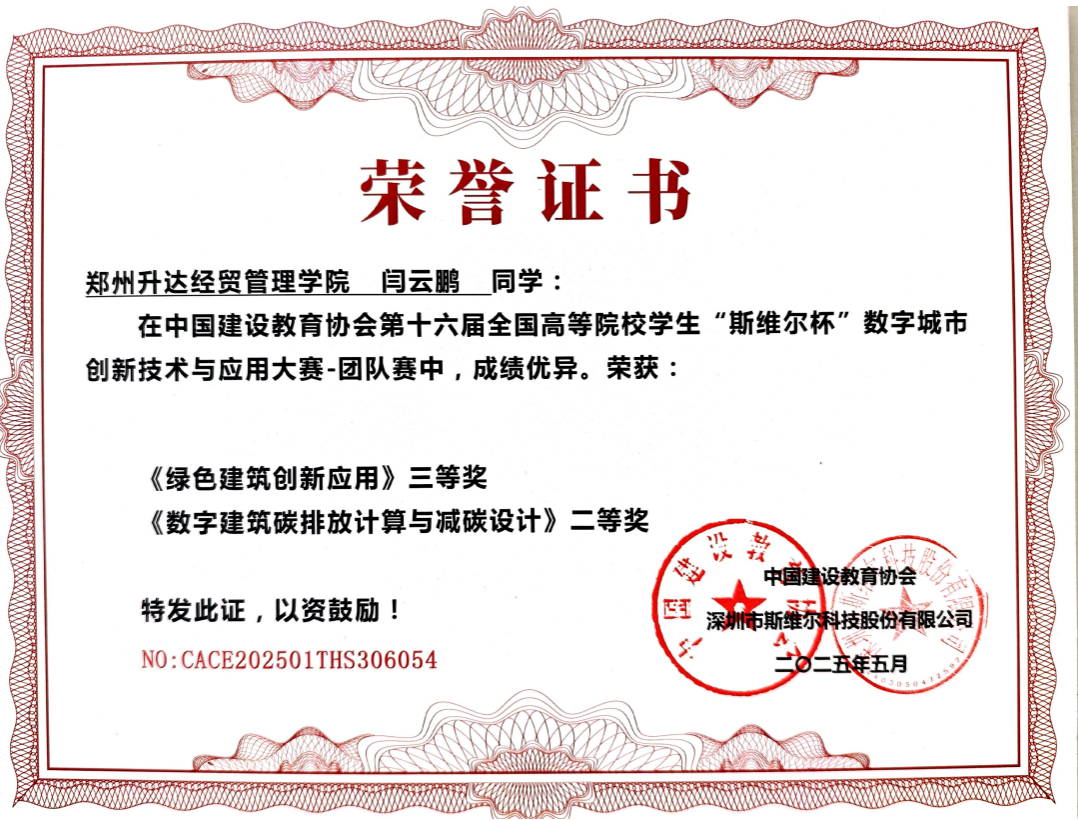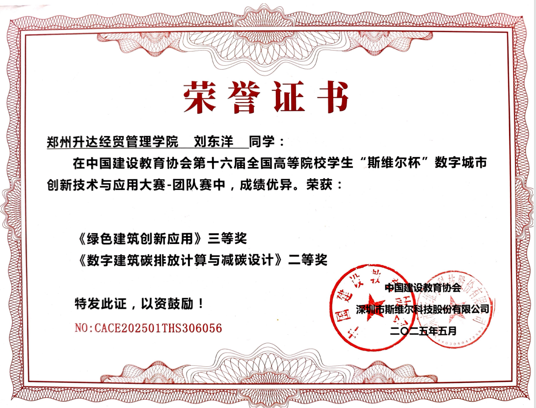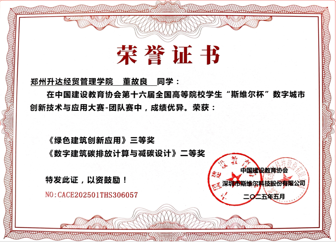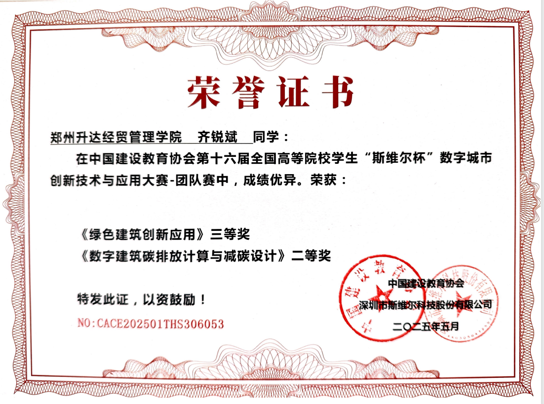 2025年4月19日,大赛总决赛在线上举行。建筑工程学院2021级建筑学专业齐锐斌、董故良、刘东洋、孙浩举、闫云鹏组成“郑州升达队”代表学校参赛,并由齐锐斌、刘东洋代表团队进行汇报,最终在223个参赛队伍中取得佳绩,荣获二等奖1项,三等奖1项。