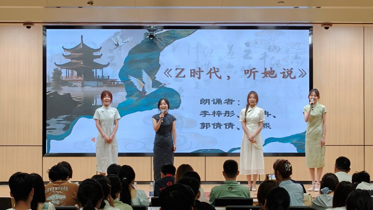 本次会议安排了外语原音配音大赛一等奖获得者申思羽同学为大家带来配音作品《简爱》,她的表演声情并茂,在场观众都沉浸其中;诵读大赛中获得一等奖的李冉、李梓彤、郭倩倩、黄熙同学为大家带来朗诵《Z时代,听她说》,生动呈现了女性冲破枷锁的坚定步伐,诠释了女性追求独立价值的精神内核,饱含深情的朗诵将现场气氛推向高潮。