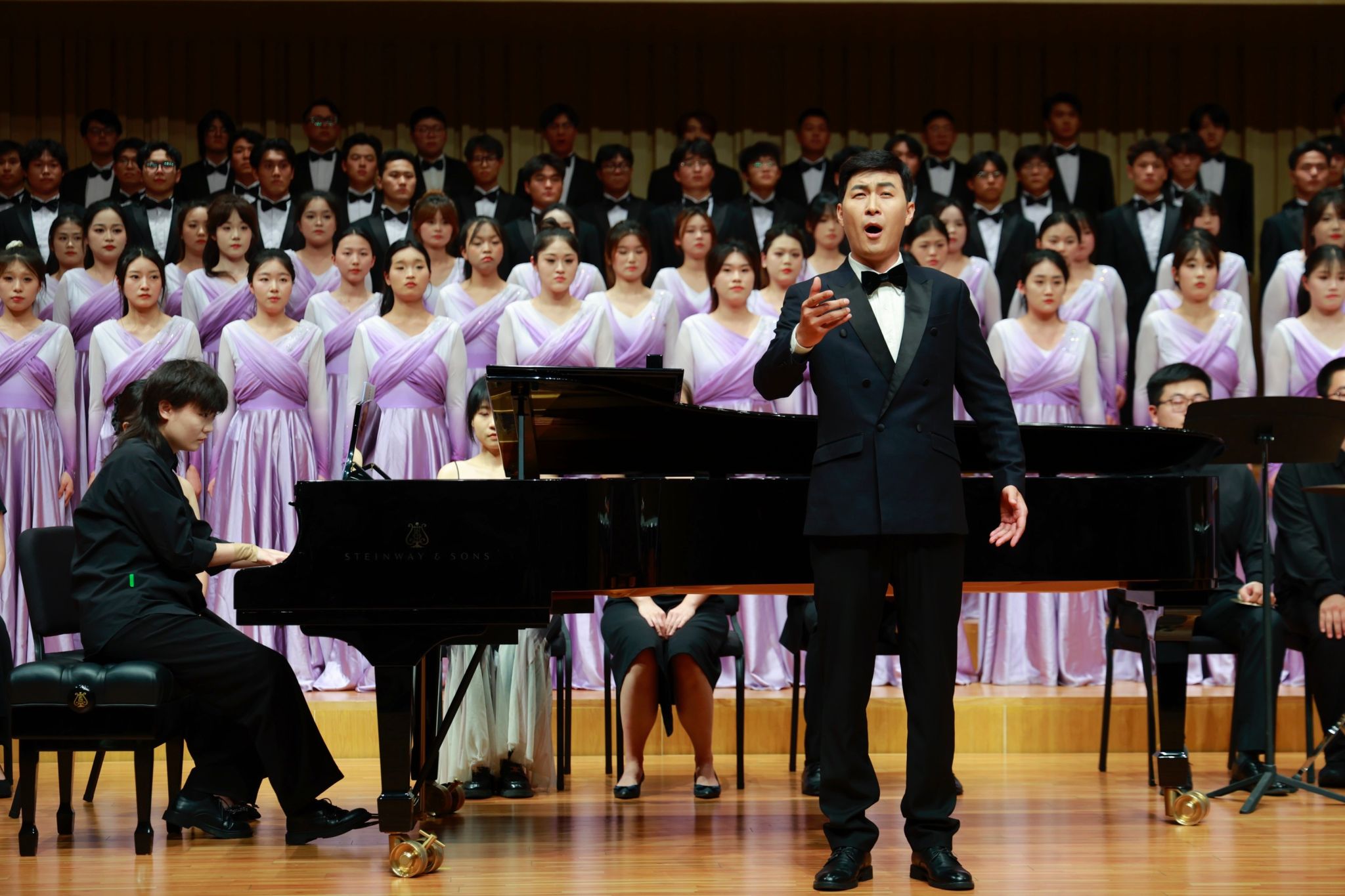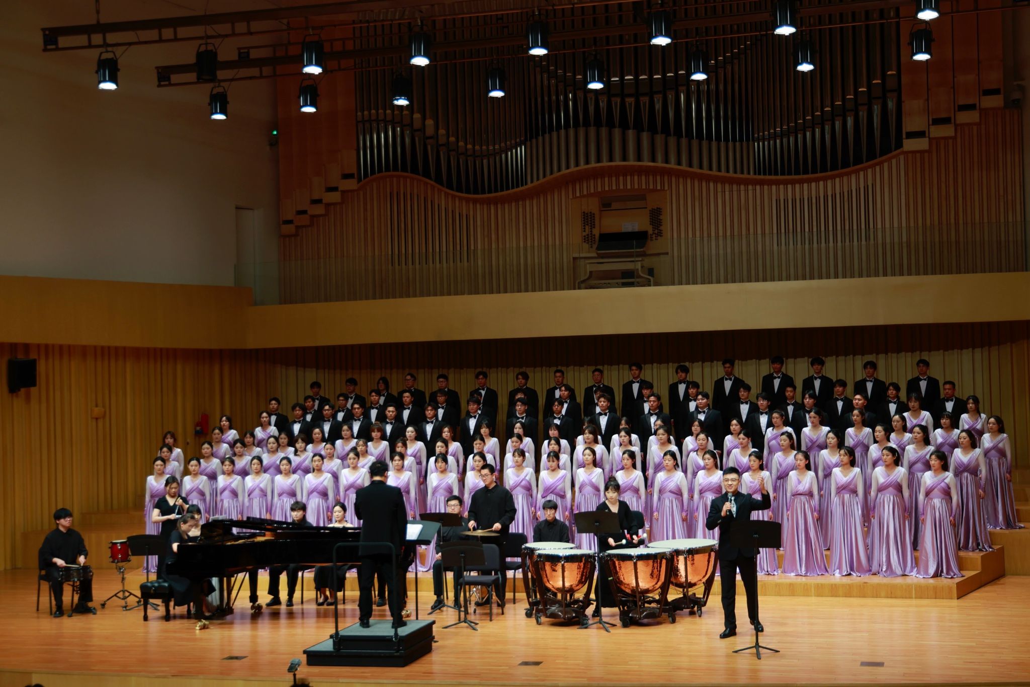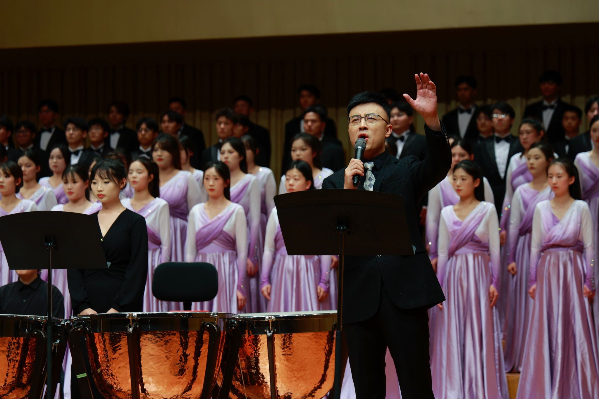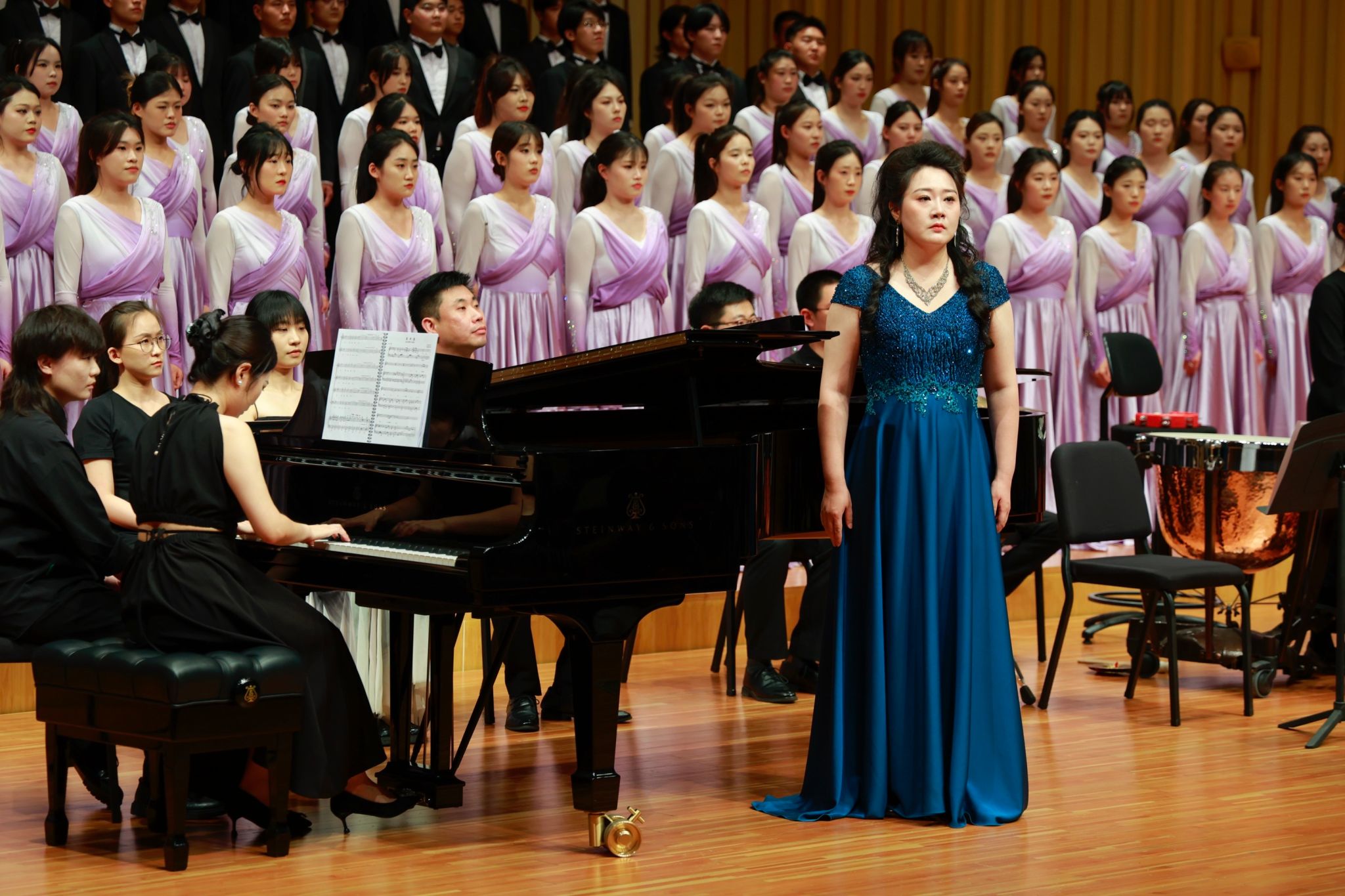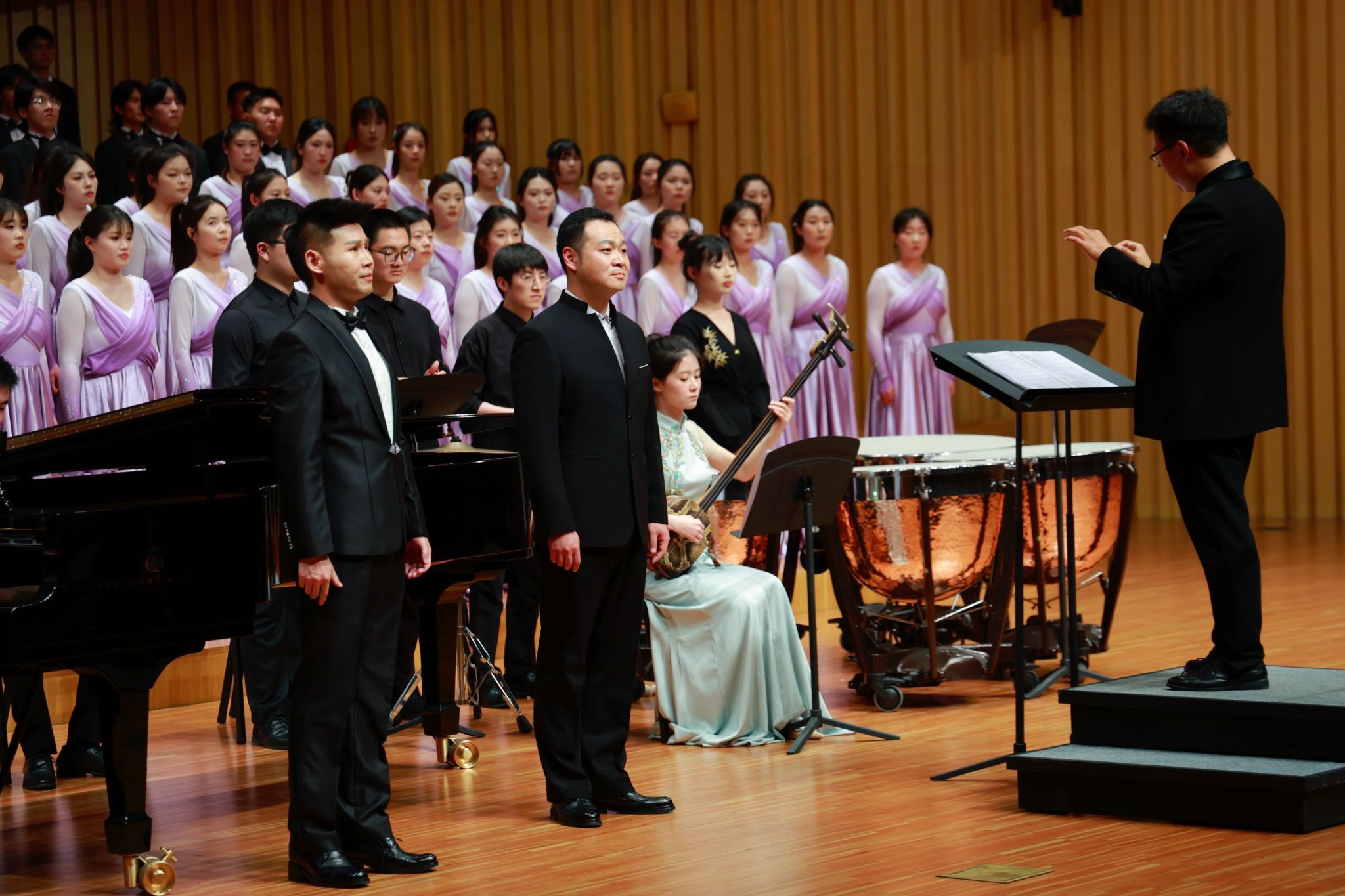 下半场,《黄河大合唱》以恢弘气势震撼登场。光未然作词、冼星海作曲的不朽名作,在指挥刘营光的引领下,由韩美爽等担任钢琴伴奏、陈家宁朗诵、盖天骄琵琶演奏、王姗三弦伴奏、范博坚等担任打击乐伴奏,艺术学院星光合唱团全力演绎,全方位的展现了黄河精神与民族力量。从《黄河船夫曲》的奋勇搏击,到《黄河颂》中朱昌铭男中音独唱的深情礼赞,从《黄河之水天上来》的磅礴之势,到《黄水谣》的苦难倾诉,从《河边对口曲》杜亮与刘新义男声对唱的质朴抗争,到《黄河怨》寇乐女高音独唱的悲愤呐喊,再到《保卫黄河》、《怒吼吧,黄河》的激昂奋进。