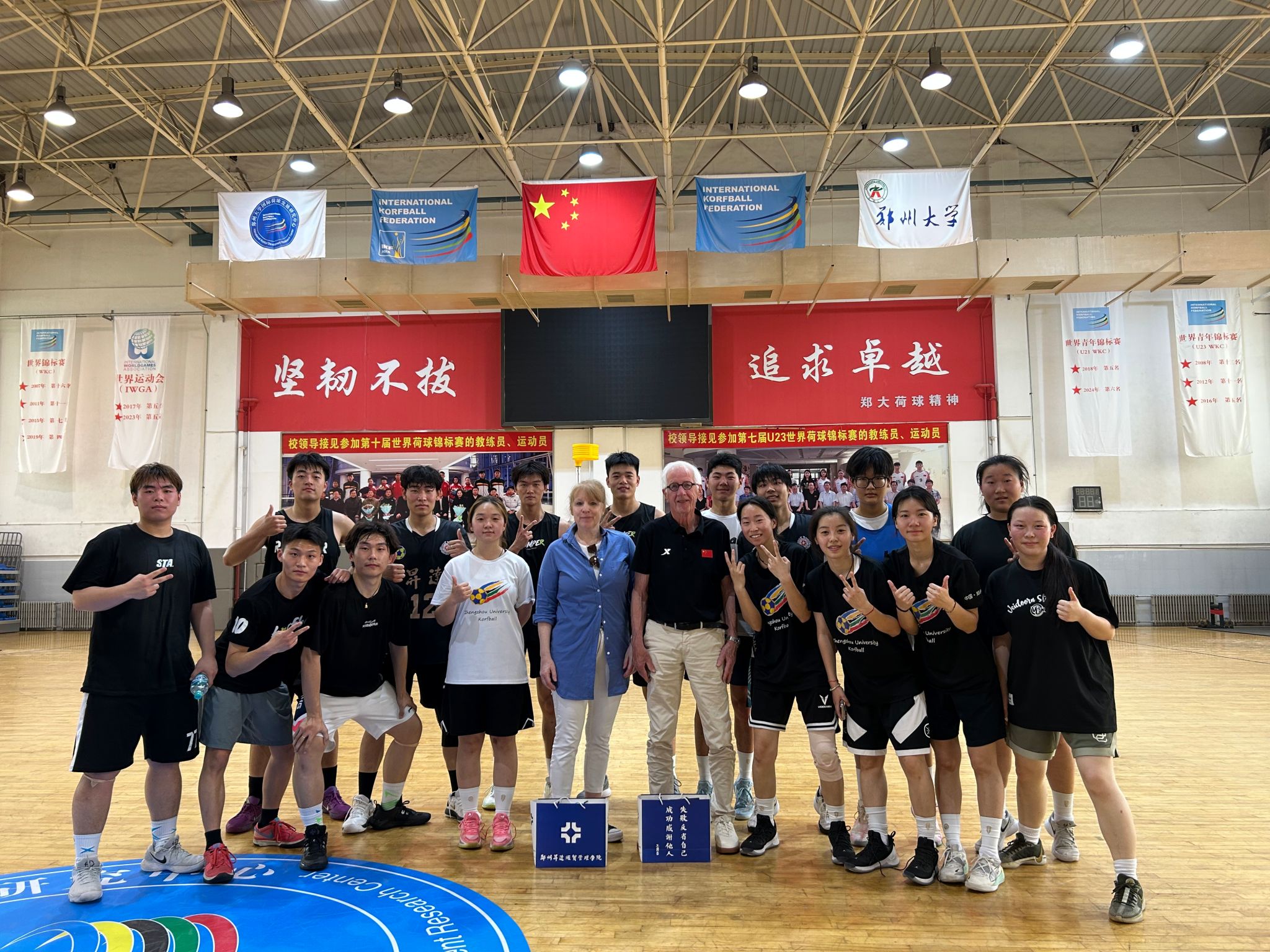 (中国国家荷球队终身荣誉主教练宾·克兰姆与冯钰涵、集训队员合影)