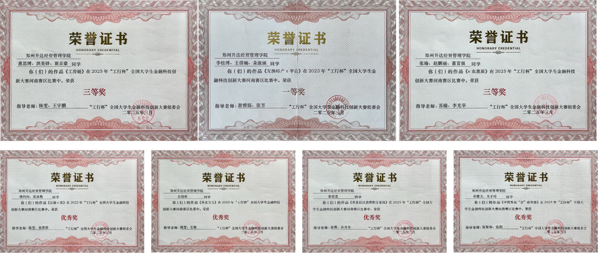 为探索金融科技前沿领域的技术突破和应用创新,为金融创新提供源源不断的储备人才,近日由中国工商银行主办的第十五届“工行杯”全国大学生金融科技创新大赛成功落幕。本次大赛以“数智金融,点亮未来”为主题,聚焦于个人金融、场景金融、美好生活、无界创想四大方向,吸引了全国6万余名学子踊跃报名,征集创新方案1.5万余件,报名人数与作品规模均创历史新高。我校金融贸易学院高度重视此次赛事,自2024年11月赛事启动开始,积极组织学生参与,共有52支团队代表学校参赛,在游雅娟、陈雯、苏楠等多名老师的指导下,共有7支学生团队脱颖而出,荣获嘉奖。其中,一队荣获河南赛区一等奖、两队荣获河南赛区三等奖、四队荣获河南赛区优秀奖。