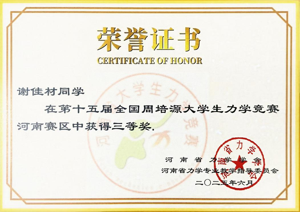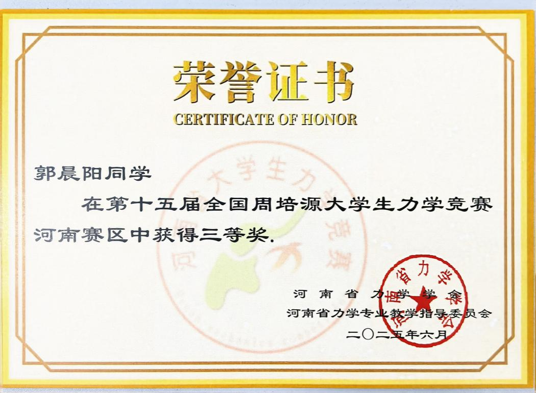 近日,第十五届全国周培源大学生力学竞赛获奖名单公布。我校建筑工程学院学子郭晨阳、谢佳材荣获河南赛区三等奖,实现了学院在该项赛事中的突破。本次竞赛由建筑工程学院教师董肖松、邵九龙全程指导。