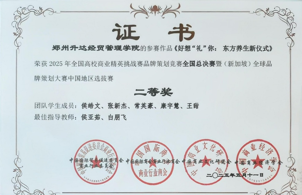 在学校领导与商学院的全力支持下,商学院院长白朋飞和侯亚茹老师带领“枣枣遇见你”队伍(团队成员有2022级市场营销本科2班的侯皓文、张新杰、常英豪、康宇慧、王甜)参赛,与河南大学、郑州经贸学院等多所高校同台竞技。商学院学子凭借出色的商业策划方案与精彩的线上展示,经过多轮激烈角逐,荣获“全国总决赛二等奖”,充分彰显了我校学子卓越的商业素养、创新能力与默契的团队协作精神。