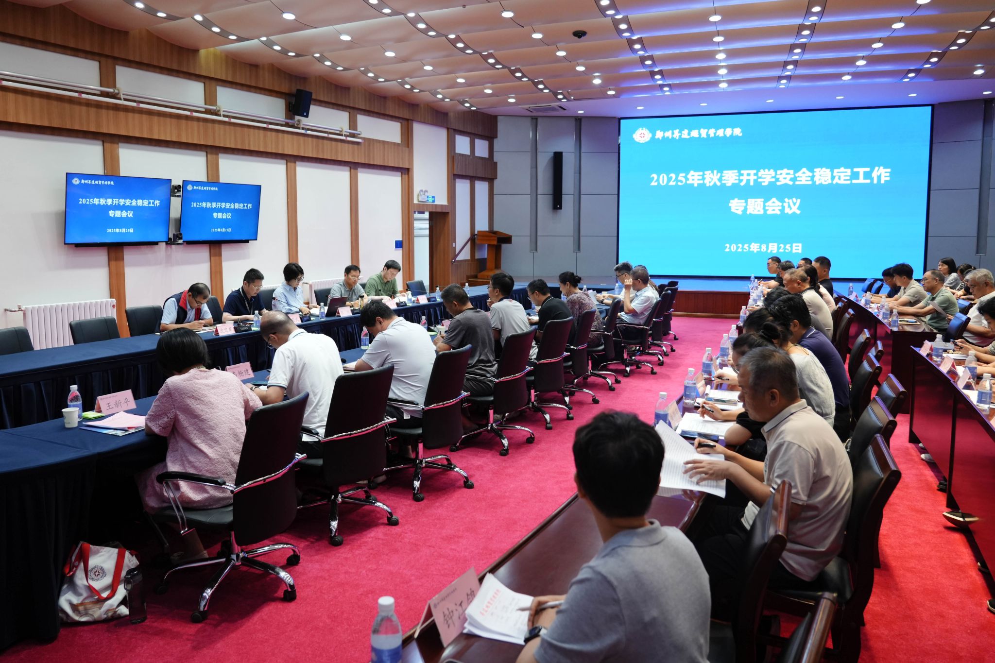 8月25日上午,学校2025年秋季学期开学安全稳定工作专题会议在国际会议厅召开。校长、党委副书记张欣,党委副书记、副校长张金安,党委委员、副校长张其武,登封校区党工委书记沈定军等出席会议,学校安全稳定工作领导小组全体成员、 二级学院党委副书记参加会议。会议由张其武主持。