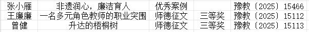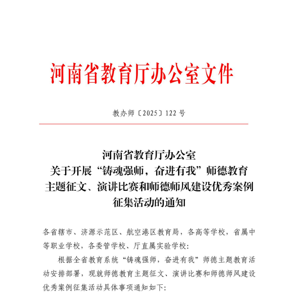 依据《河南省教育厅办公室关于公布“铸魂强师,奋进有我”师德主题教育征文、演讲比赛和师德师风建设优秀案例评选结果的通知精神》,我校荣获师德师风建设优秀案例1个,师德主题教育征文三等奖2个。