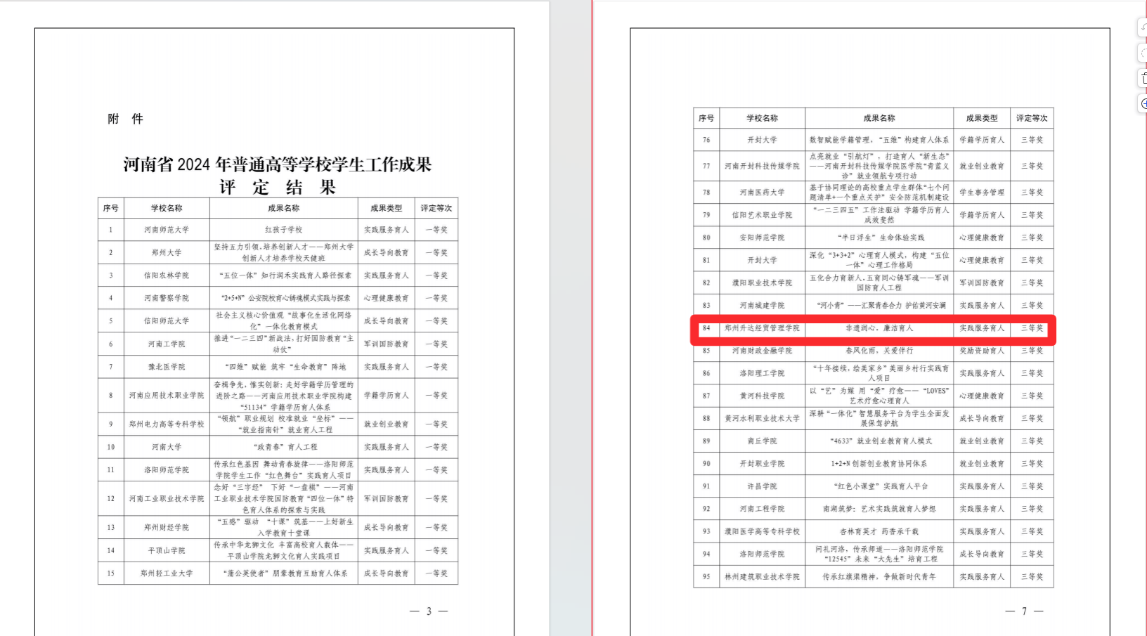 近日,河南省教育厅公布了2024年普通高等学校学生工作成果评定结果,我校报送的《非遗润心 廉洁育人》获得三等奖,实现了学校此项工作的突破,充分展现了我校学生工作的创新实践和育人成效。