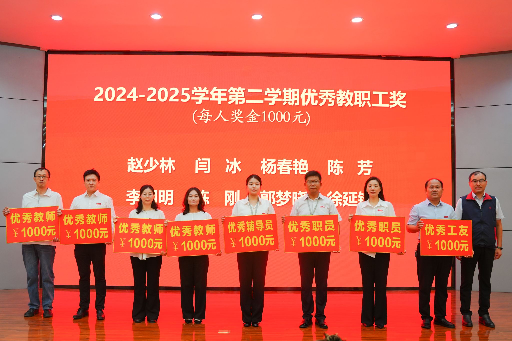 校领导分别为各项获奖教职员工颁发证书、奖金并合影留念。会场洋溢着浓浓的节日气氛,不时传来一阵阵热烈的掌声。