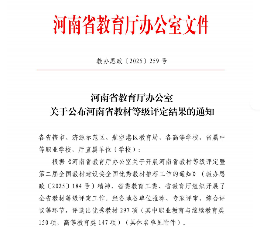 近日,河南省教育厅办公室正式发布《关于公布河南省教材等级评定结果的通知》(教办思政〔2025〕259号),我校推荐申报的《投融资决策分析》荣获河南省教材等级评定二等奖。此次获奖是我校在教材建设领域的又一重要突破,彰显了我校在高质量教材建设方面的显著成效。