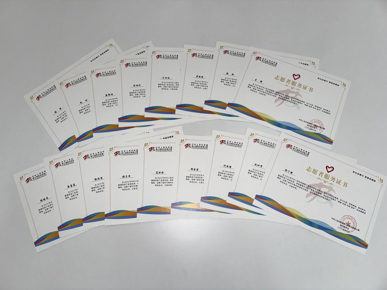 近日,中华人民共和国第三届职业技能大赛执行委员会授予我校“优秀志愿服务组织单位”荣誉称号,354名师生志愿者荣获“志愿者服务”荣誉证书。第三届全国职业技能大赛以“技能照亮前程”为主题,来自全国3420名技能健将参赛。大赛期间,现场观赛18.3万人次,同期开展了技能强国论坛、技能展示交流和绝技绝活展演。我校共选派354名师生志愿者参加本次大赛的志愿服务工作,主要围绕赛事协助、嘉宾接待、观众服务、媒体服务、展示交流、后勤保障等6大类别28项开展专业化志愿服务,用青春智慧为大赛顺利举办保驾护航。