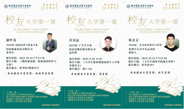 紧扣新生需求,打造有温度的启蒙课堂。为深入贯彻落实河南省教育厅关于2025级新生入学教育“职业生涯发展第一课”的通知要求,我校校友工作办公室携各二级学院迅速行动,以“凝心聚力助就业 不负韶华早扬帆”为主题,精心筹备优秀校友代表返校报告会系列活动,为新生送上兼具温度与深度的职业生涯启蒙盛宴。自2025级新生入学伊始,近20期报告会陆续开讲,曾经从升达启航、在各行各业绽放光彩的校友们重返母校,化身“成长引路人”。