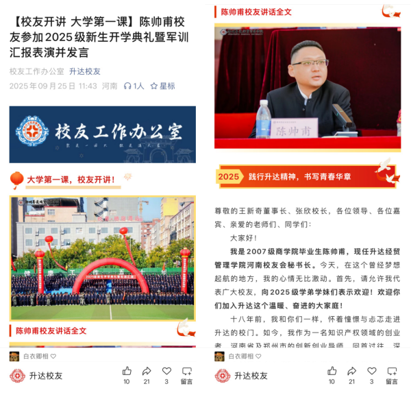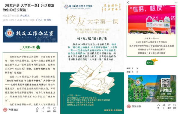 注重全程保障,构建全链条的宣传体系。活动全程彰显细致考量:为返校校友定制专属邀请函以作纪念,前期通过多渠道发布活动预告,后期及时整理内容回顾,校官网、微信公众号、小程序等平台同步更新,构建起“预告-实施-复盘”的全链条宣传体系,让每一份校友情怀都被看见,每一次分享价值都能延伸。正如活动传递的理念——“与升达校友同行,与升达力量同行”,这场特殊的“第一课”,让新生在温暖引航中锚定了大学航向。
