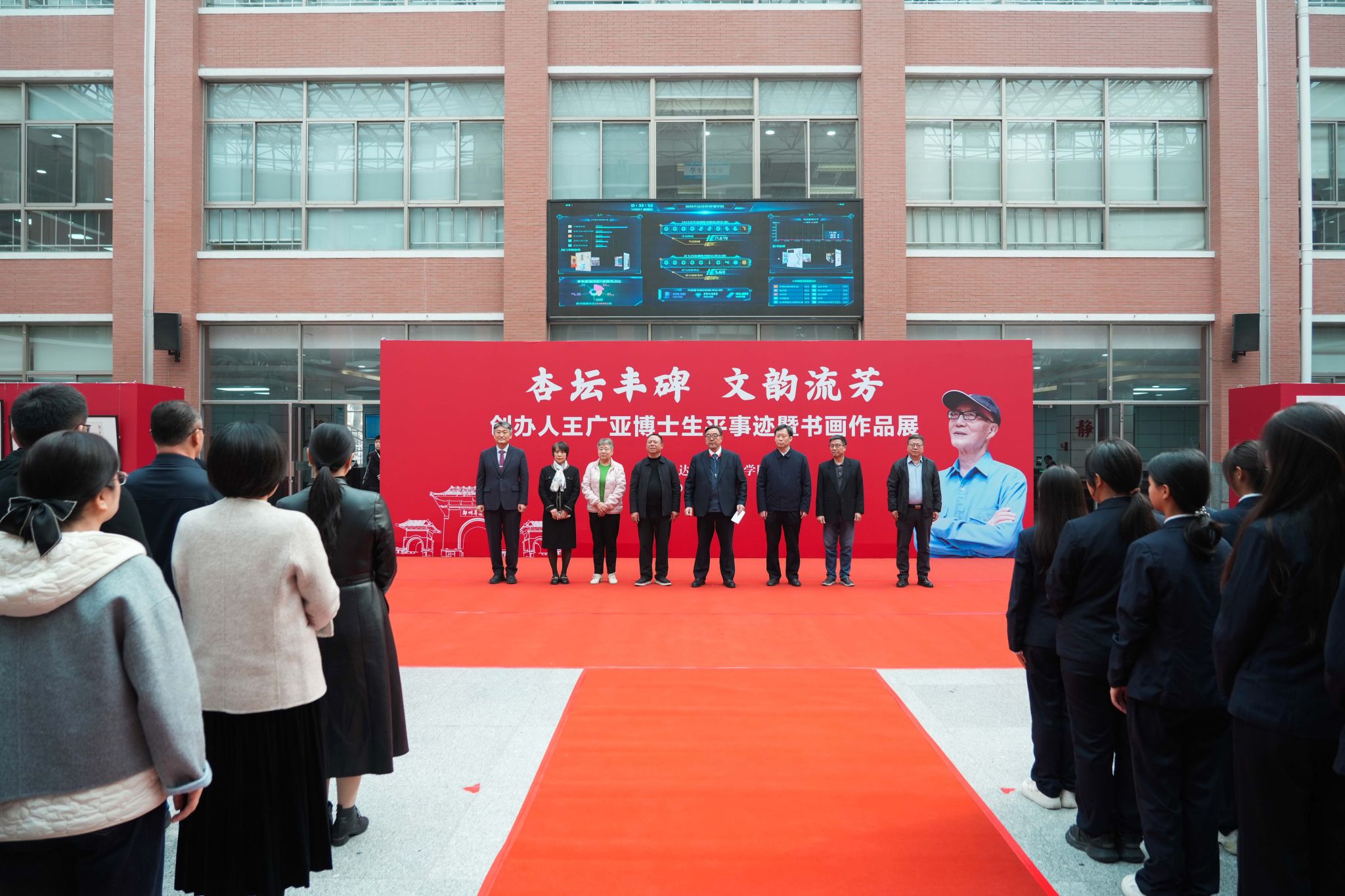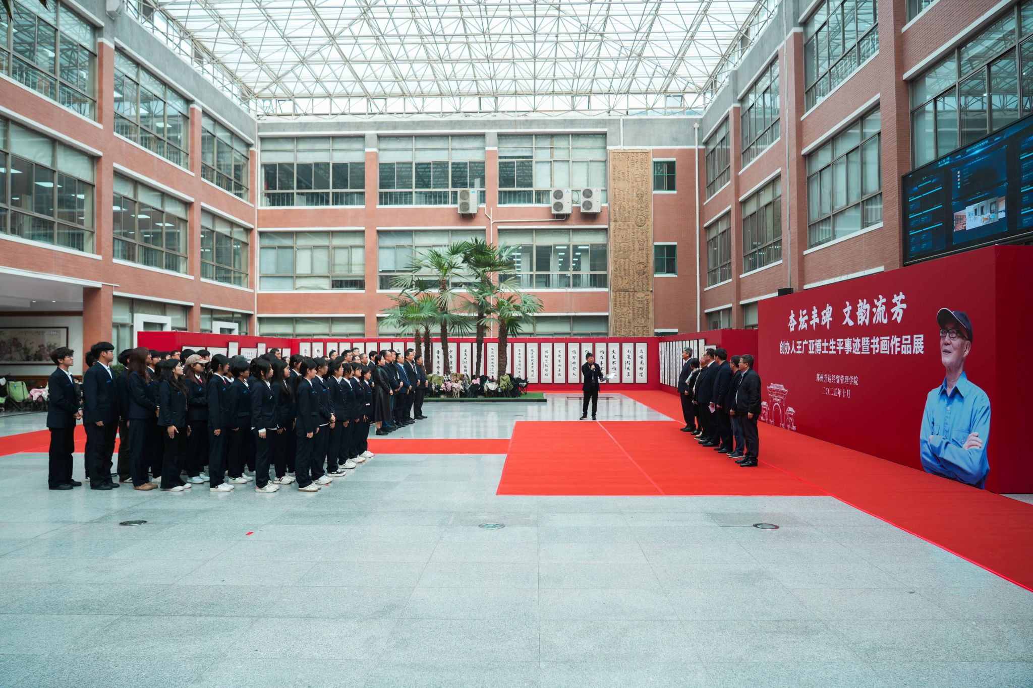 丹青绘初心,翰墨寄追思。10月31日上午,我校“杏坛丰碑 文韵流芳——创办人王广亚博士生平事迹暨书画作品展”在图书馆中厅隆重开幕。中原工学院纪委书记张爱华,新郑市龙湖镇镇长冯举涛,郑州市台资企业协会副会长林英源,韩国南部大学国际协力处处长具珉,龙湖镇泰美食品总经理柴雪云,我校董事长王新奇博士、校党委委员、副校长张其武等校领导与学校各部门主管、师生代表100余人齐聚一堂,共同追忆王广亚博士筚路蓝缕的办学之路,感悟其笔墨间流淌的深厚文化底蕴。开幕式由张其武主持。