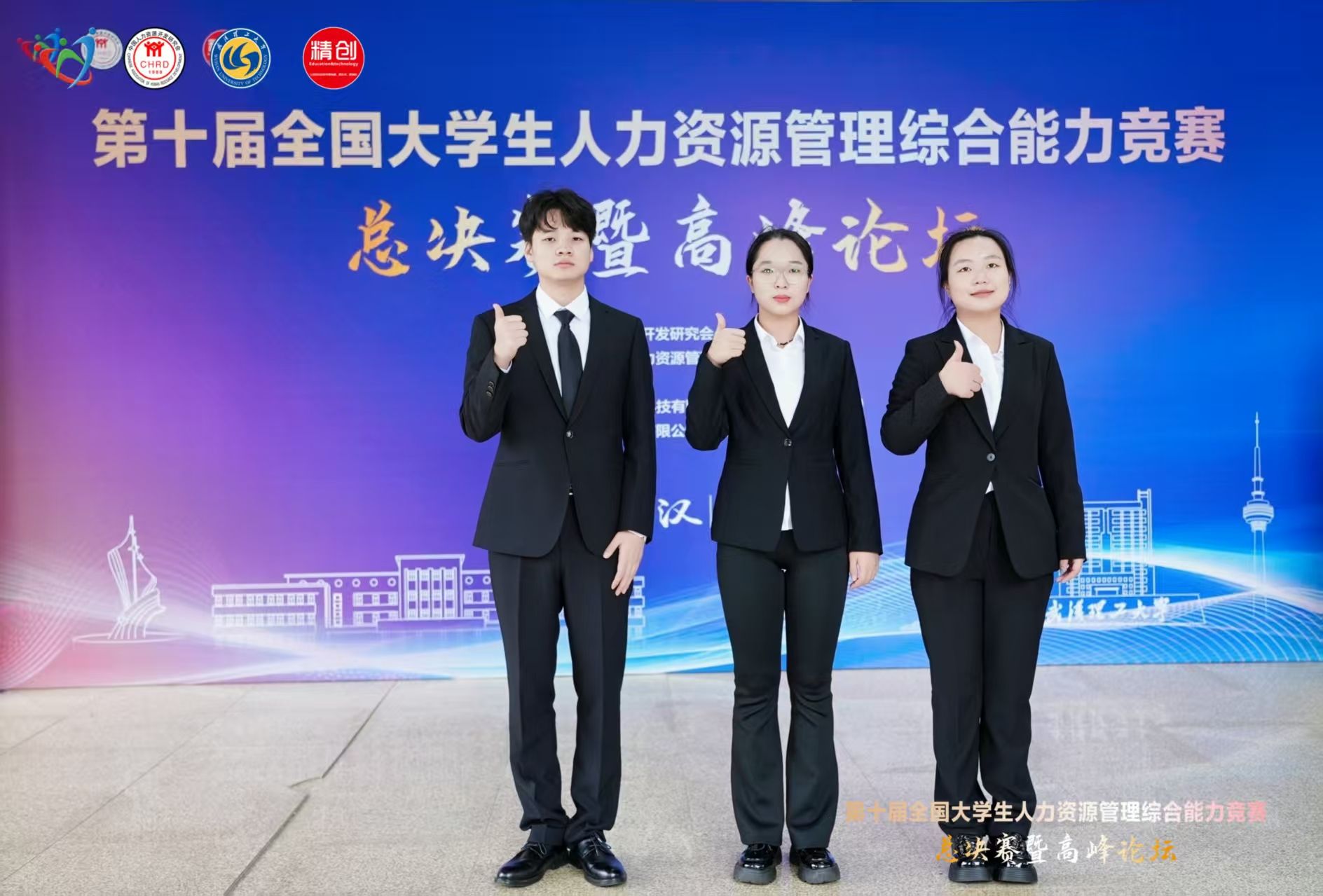 2025年11月9日,第十届全国大学生人力资源管理综合能力竞赛全国总决赛在武汉理工大学南湖校区顺利落幕。我校管理学院人力资源管理专业吴东炜、刘可欣、焦平汉3名学生组成的参赛团队,在指导教师蒋杨鸽、王丹丹的带领下,从全国百余支参赛队伍中突围,最终荣获全国一等奖。