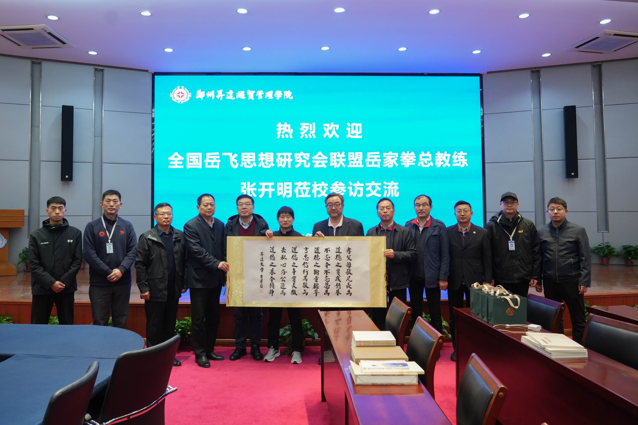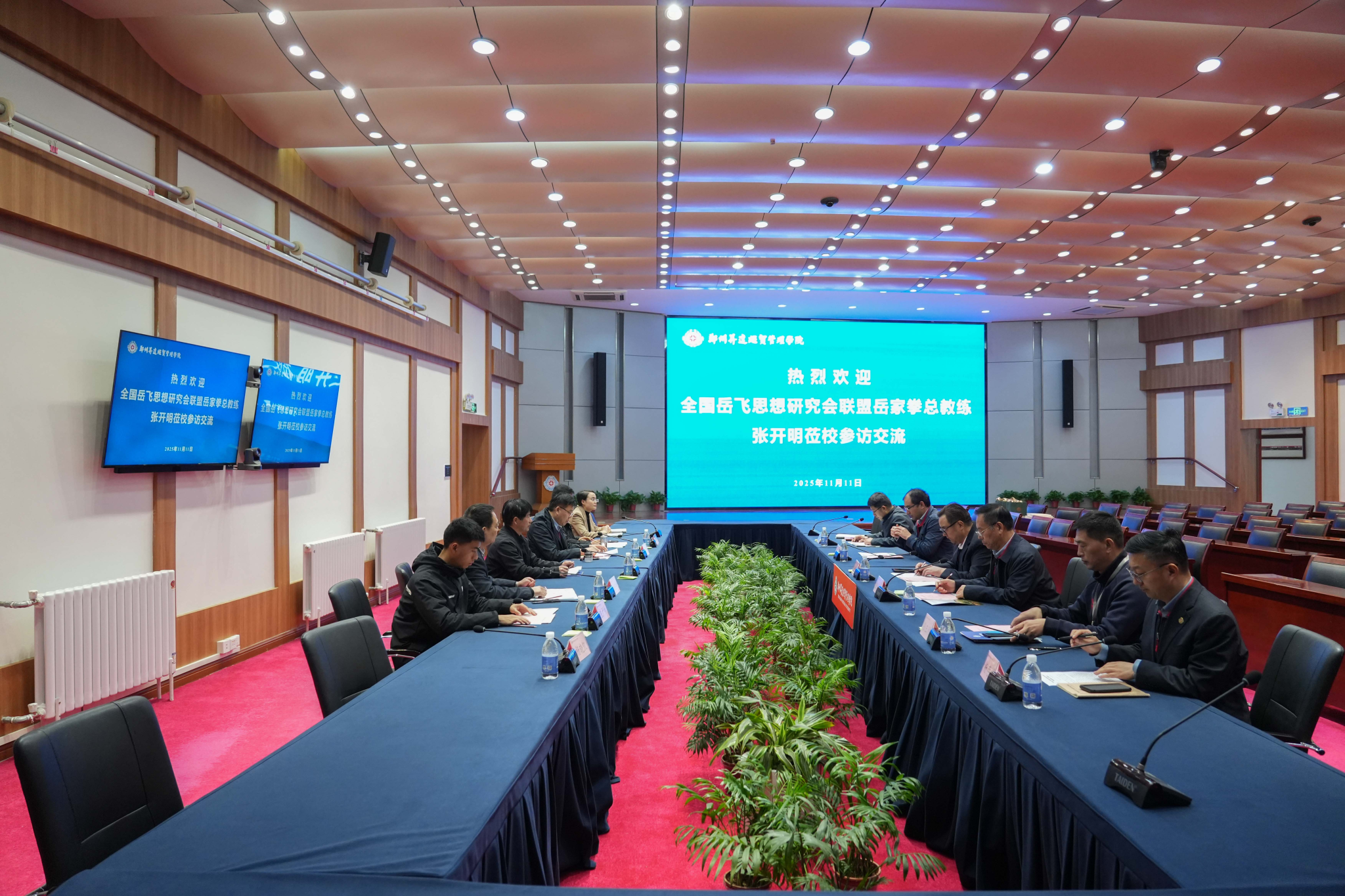 2025年11月11日上午,全国岳飞思想研究会联盟岳家拳总教练张开明先生一行莅临我校参访交流。活动在行政楼国际会议厅举行,学校董事长王新奇博士,党委副书记、副校长张金安,登封校区党工委书记沈定军及部分主管共同出席。会议由校地合作处处长王彦雨主持。