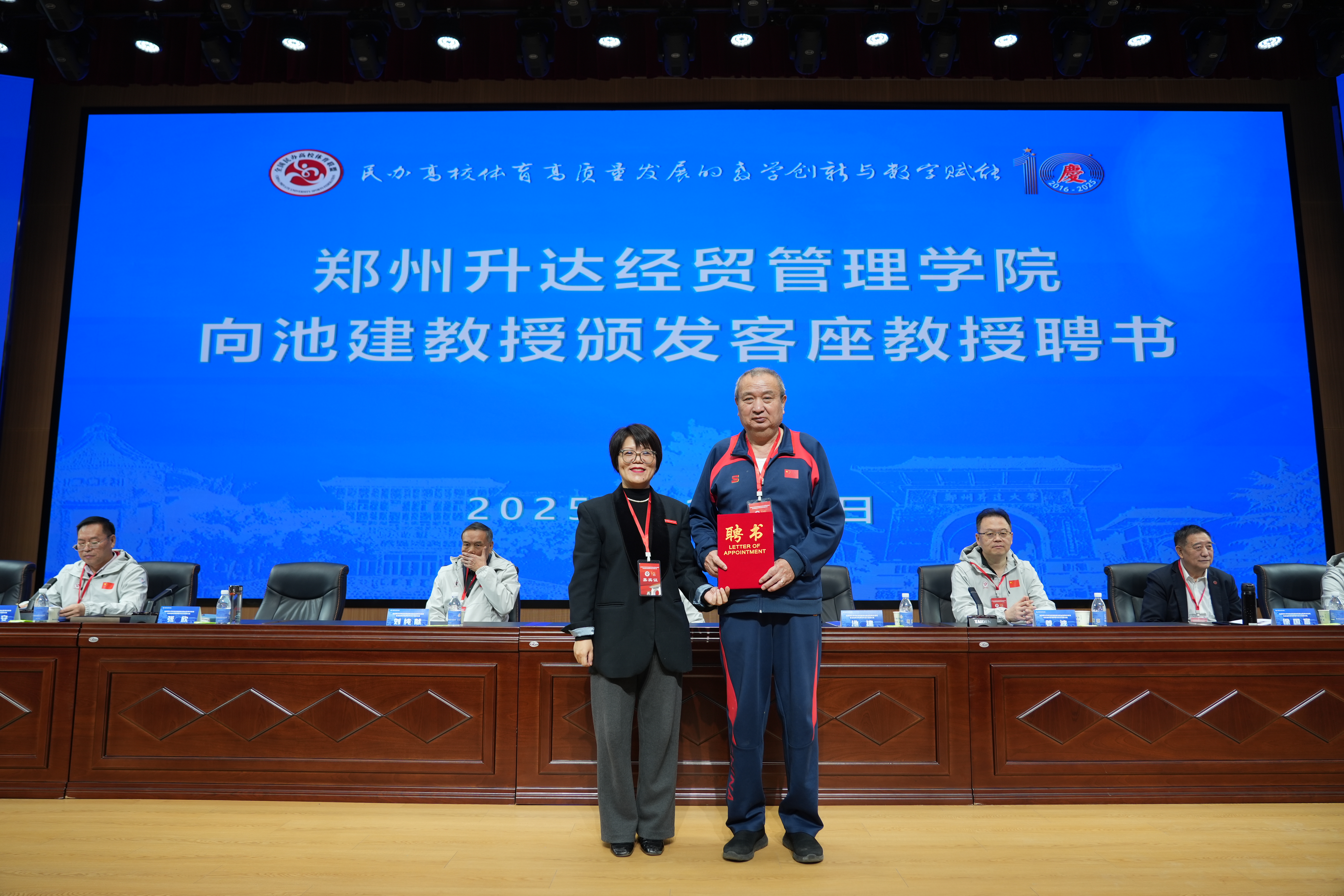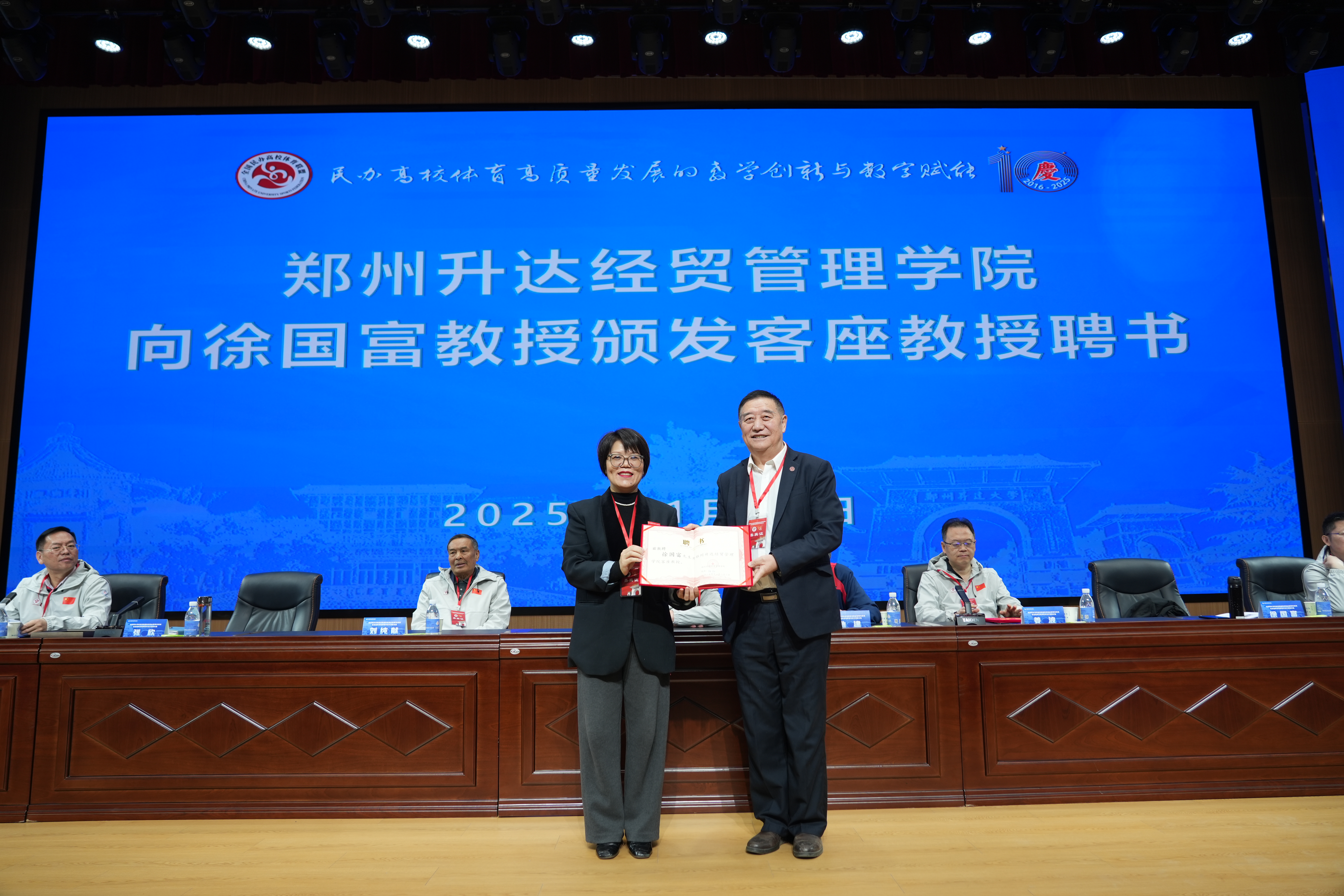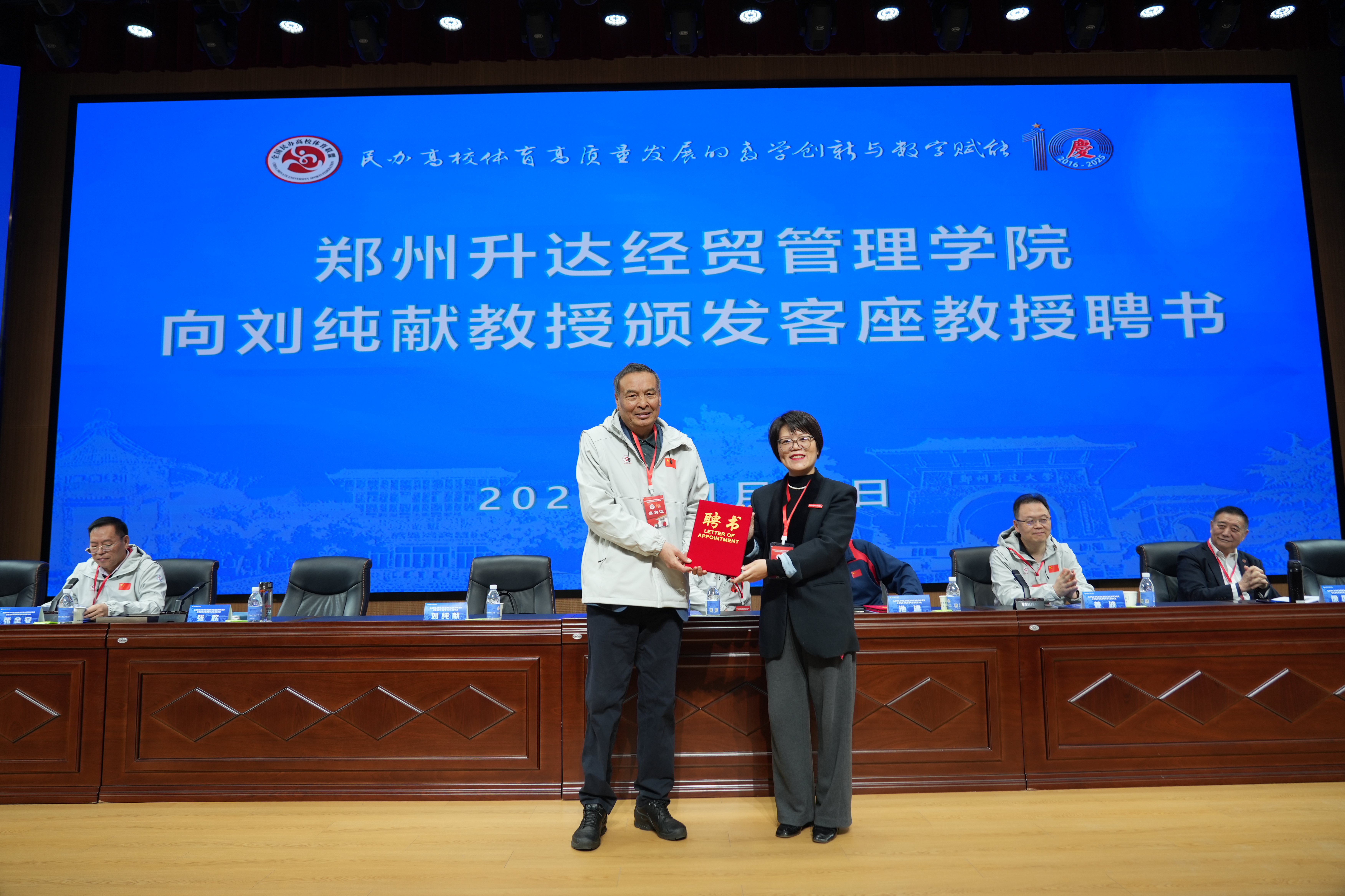 张欣、姜波分别代表升达和全国民办高校体育联盟理事会互赠纪念品。张欣代表学校向莅会的嘉宾池建、姜波、刘纯献、徐国富颁发客座教授聘书。