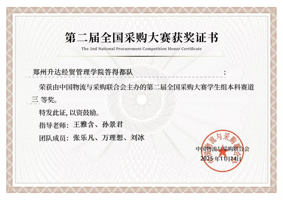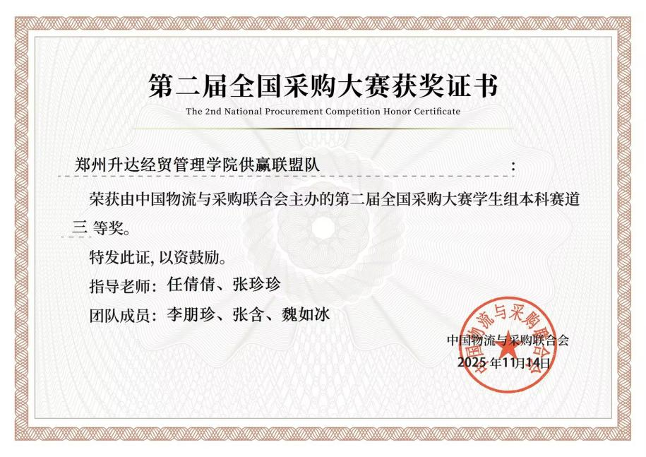 此次获奖,不仅是对同学们专业知识与实践能力的肯定,也是商学院物流管理专业持续推进“以赛促学、以赛促教”教学改革成果的生动体现。通过参与高水平学科竞赛,极大地激发了学生的学习热情,锻炼了其解决复杂问题的综合能力,为未来培养高素质的采购管理人才奠定了坚实基础。