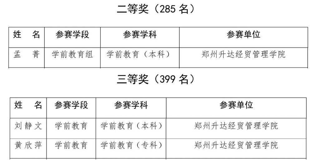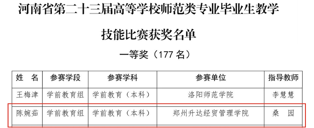 近日,由河南省教育厅主办的河南省第二十三届高等学校师范类专业毕业生教学技能比赛落下帷幕。我校文法学院学生陈婉茹荣获学前教育本科组省级一等奖,并在学前教育本科组中排名全省第二,这也是我校学前教育专业连续四届获得该赛事一等奖。此外,孟菁和刘静文、黄欣萍三位同学分别荣获二等奖和三等奖,指导老师桑园荣获“优秀指导教师”称号。
