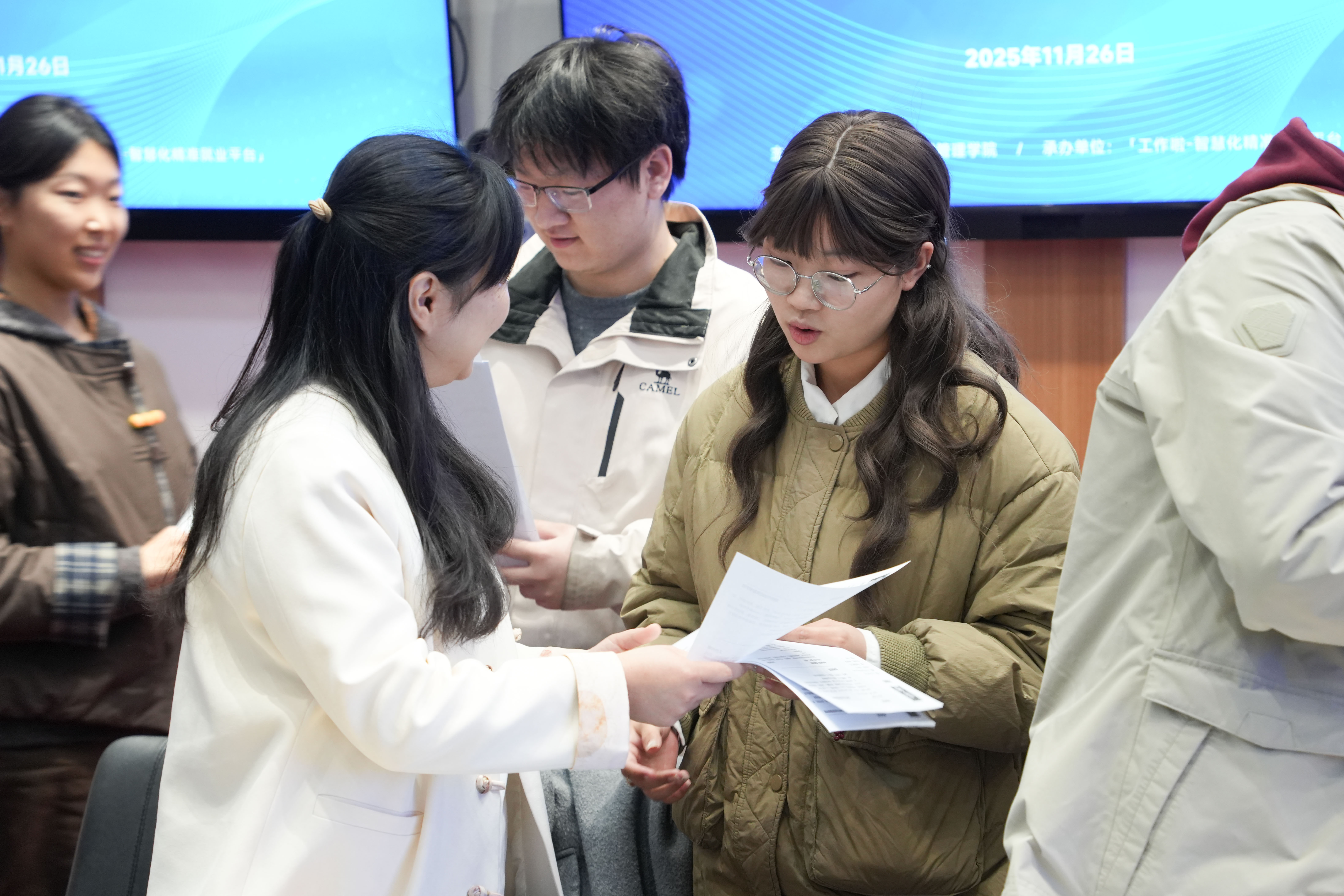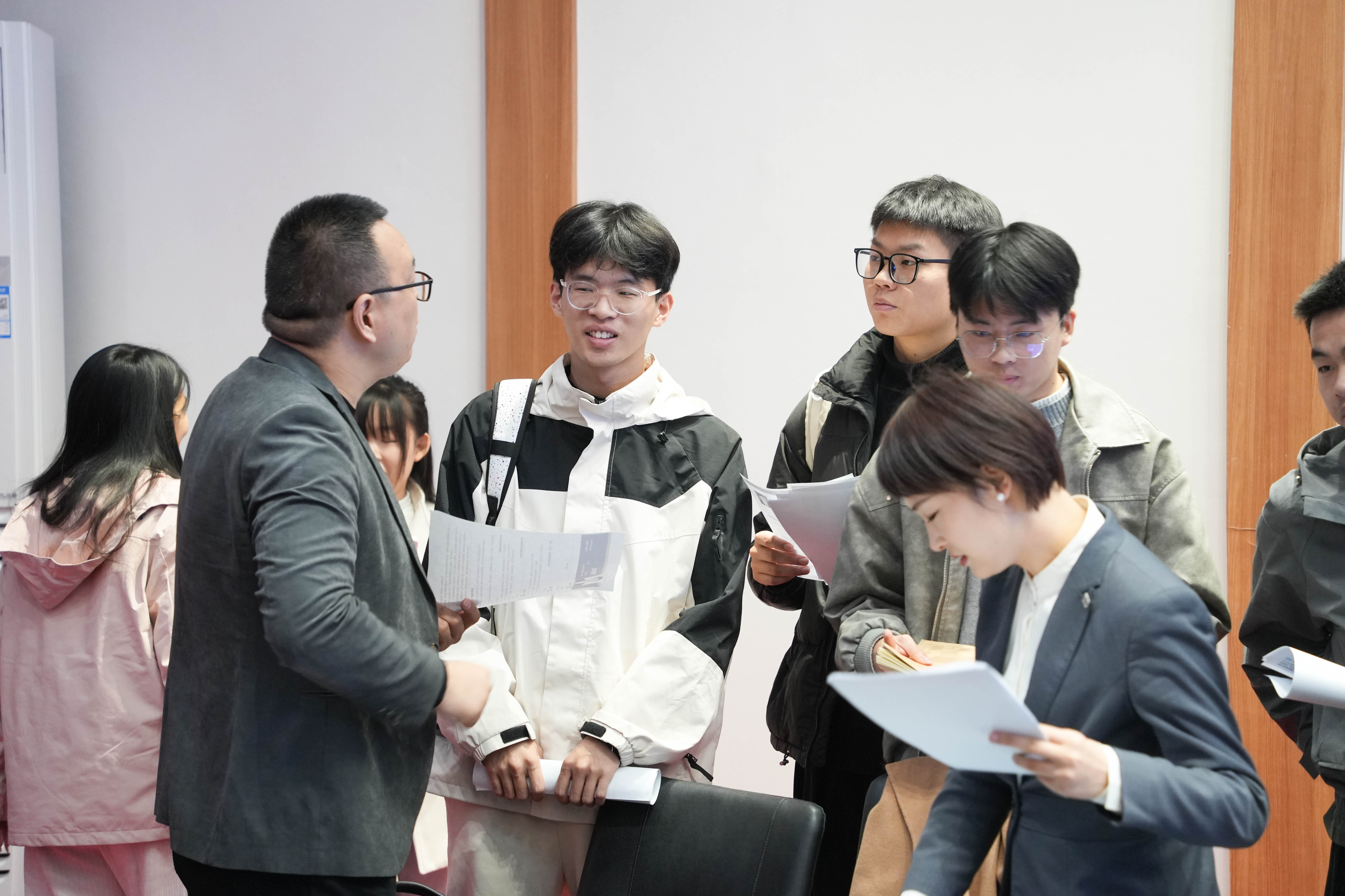 总结发言结束后,活动进入学生现场对接投递简历环节。参会应届毕业生代表带着精心准备的简历,与各企业负责人进行一对一交流,详细咨询岗位信息、招聘要求及职业发展前景,企业负责人耐心解答学生疑问,并现场接收简历,部分企业还与意向学生初步达成了面试意向,实现了供需双方的精准对接。