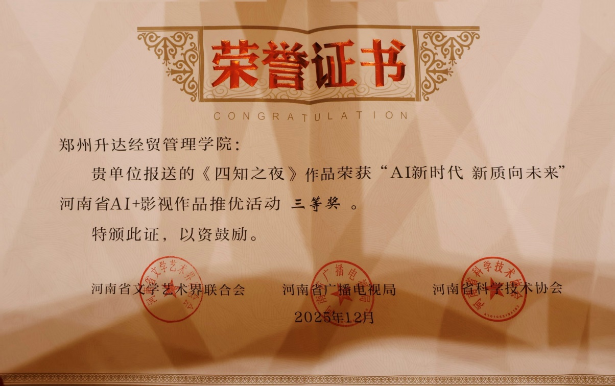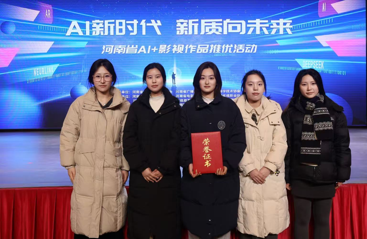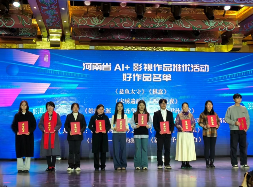 12月20日,在洛阳举行的“AI新时代新质向未来”——河南省AI+影视作品推优盛典暨AI+洛绣艺术展活动中,由我校文法学院惠阳、张彩两位老师指导,肖彤翔、张金盈、王璐等同学创作的AI影视作品《四知之夜》,从全国众多参赛作品中脱颖而出,荣获大赛三等奖。