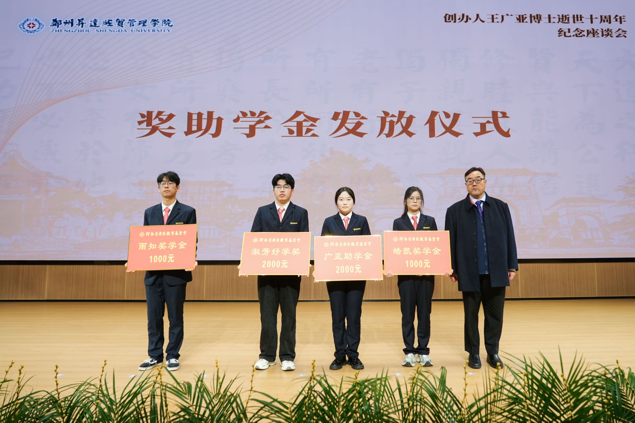 为弘扬王广亚博士“慈善育人、惠泽四方”的精神,会议举行了河南省广亚教育基金会奖助学金颁发仪式。本学期,共有433名学生获得广亚助学金、淑芳好学奖、皓凯奖学金及雨知奖学金。更令人感动的是,李朝、王惠杰等十余位爱心人士现场追加捐赠52万元善款,支持学校教育事业,董事长王新奇博士为其颁发了捐赠证书。