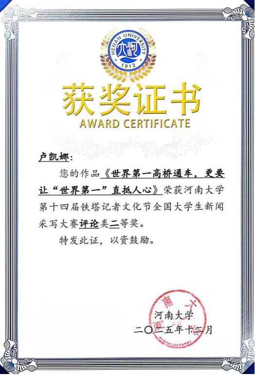 荣获二等奖的作品来自于新闻学和网络与新媒体两个专业的同学。2023级新闻学专业学生邹长倩、梅晓彤、李慧茹的作品《“三重门”羁绊,医专生出路在哪?》荣获非虚构类二等奖;2023级网络与新媒体专业学生魏羽桐、张梦瑶、吴靖慧的《“新农人”在行动——河南大学生返乡创业,把握时代“鸡”会》获通讯类二等奖,卢凯娜的《世界第一高桥通车,更要让“世界第一”直抵人心》获评论类二等奖;2021级网络与新媒体专业学生常家宝、张瑞萌、魏晓莎的《国棉记忆》获视听类二等奖。