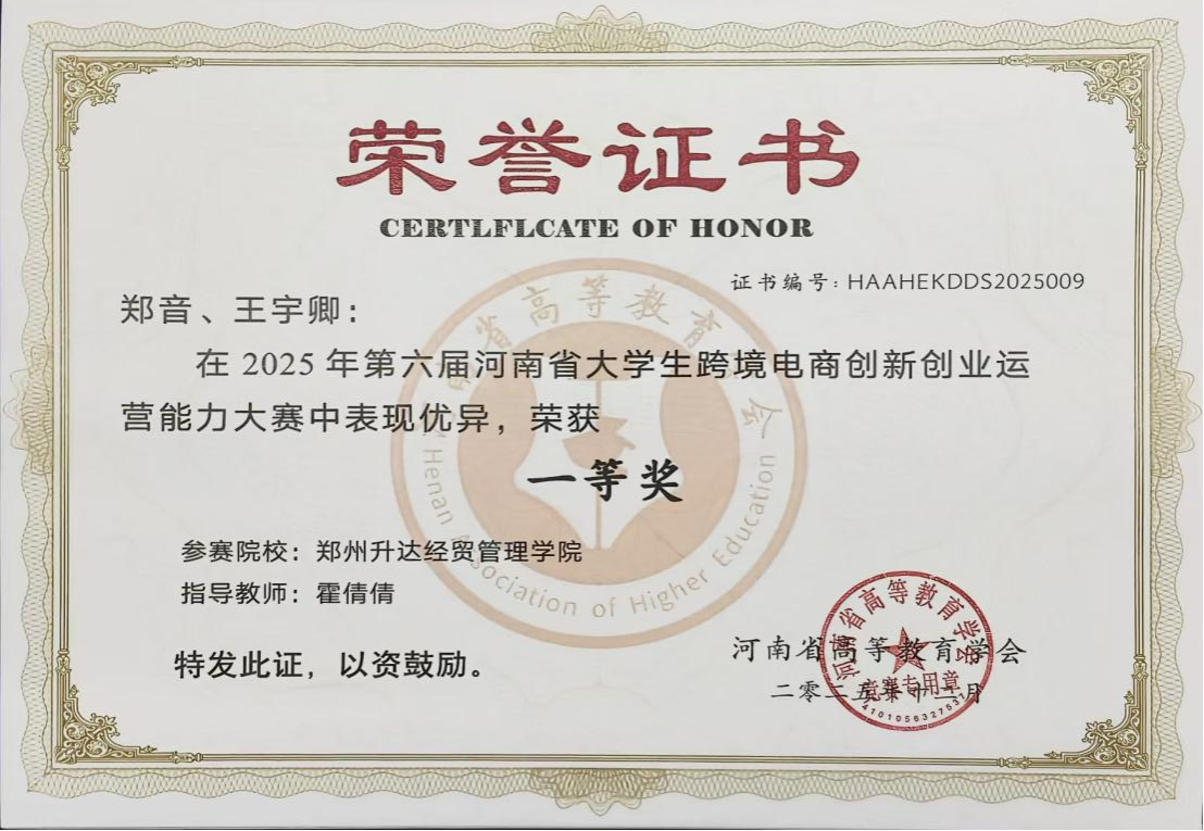 近日,由河南省高等教育学会主办的“第六届河南省大学生跨境电商创新创业运营能力大赛”落下帷幕,经过2天的激烈角逐,我校商学院跨境电子商务专业的郑音和王宇卿两名学生组成的参赛队脱颖而出,荣获“团体一等奖”。