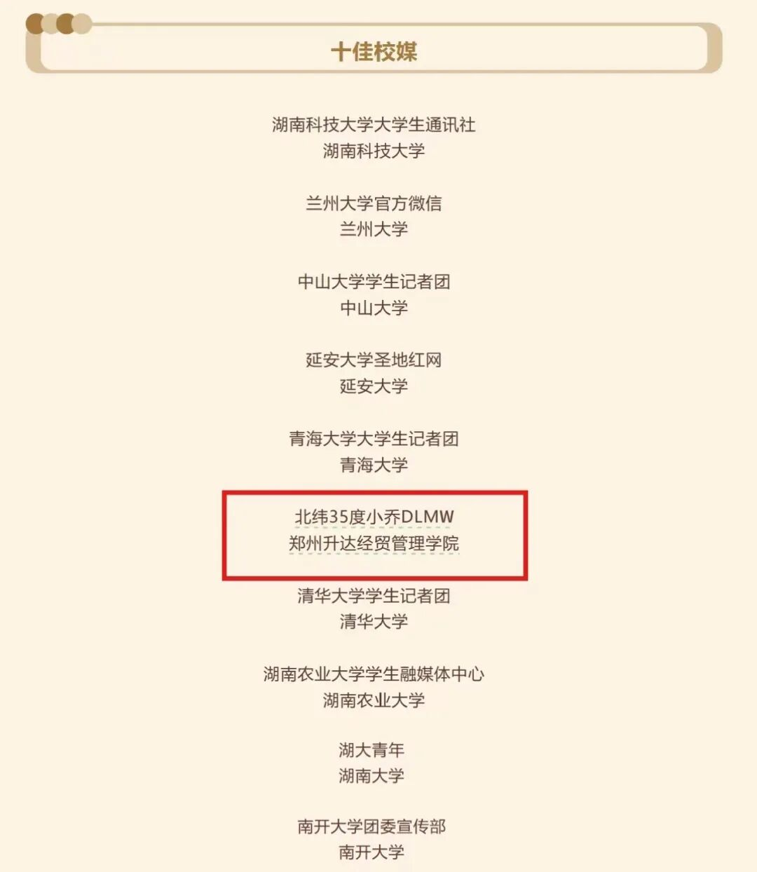 由文法学院师生创办的“北纬35度小乔DLMW”凭借清晰的定位、优质的原创内容与积极的传播影响力,从全国众多高校中脱颖而出,与清华大学学生记者团、兰州大学官方微信等10家单位荣获“十佳校园媒体”称号。