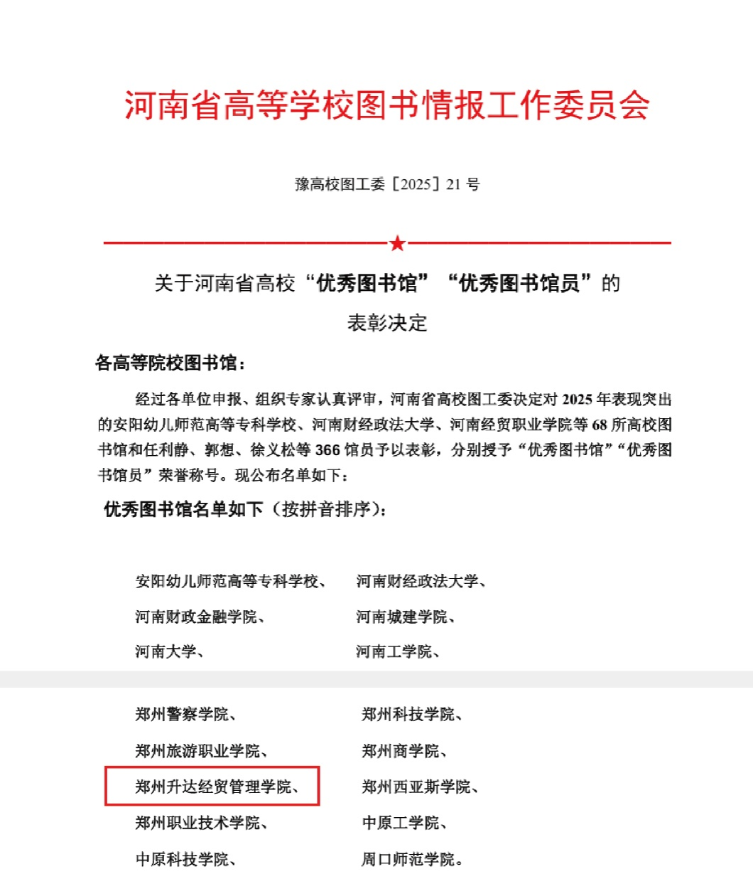 近日,河南省高等学校图书情报工作委员会印发《关于表彰2025年度河南省高校“优秀图书馆”和“优秀图书馆员”的决定》。经省高校图工委组织专家严格评审,我校图书馆脱颖而出,获评2025年度河南省高校“优秀图书馆”,何会、李华、刘乾、郑晶四名馆员荣获“优秀图书馆员”称号。