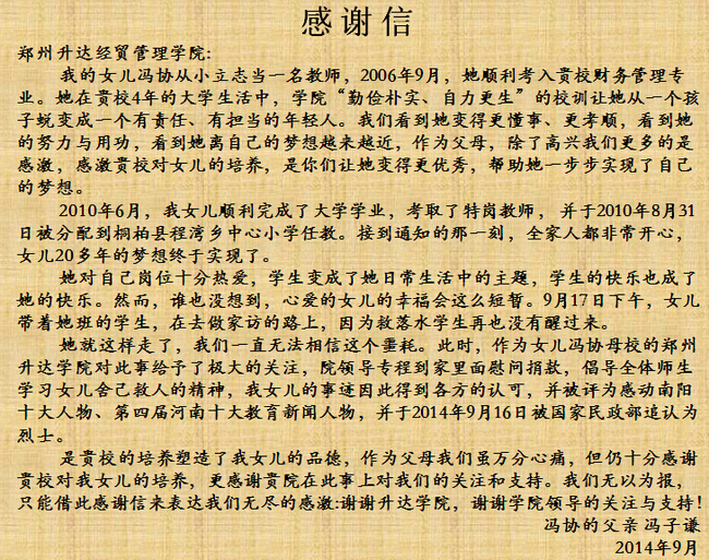 前不久,在冯协校友被追认为烈士之后,冯协的父亲冯子谦专程从南阳新野县来到郑州,向我院送来感谢信,感谢我院将他的女儿冯协培养成一位具有奉献精神的优秀教师,塑造了她的高尚品德;感谢我院在他的女儿冯协为抢救落水学生光荣牺牲后的道义支持、热情慰问、慷慨捐款。现将感谢信附后。