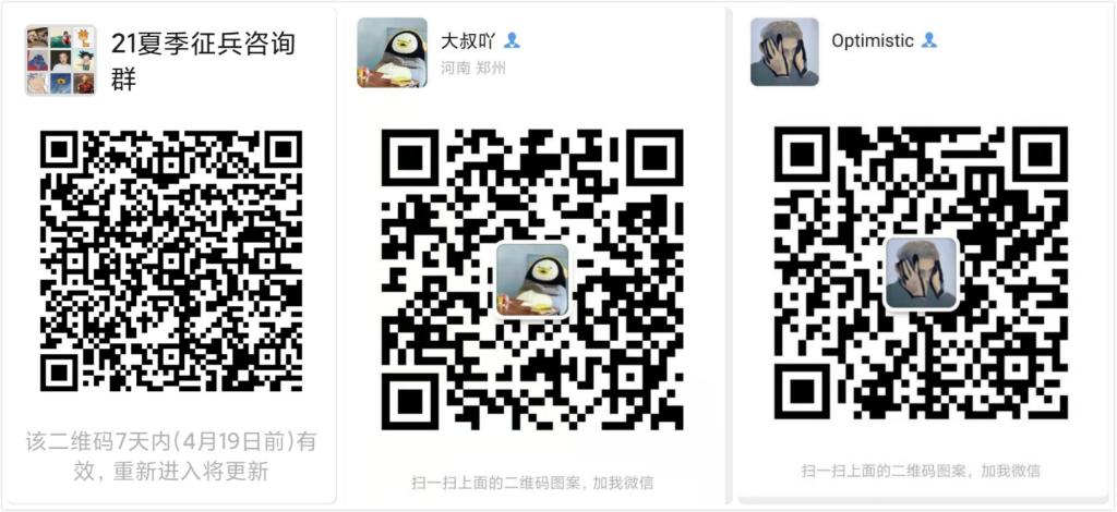 1、凡参加2021年夏季征兵的适龄青年,请扫码进入学校夏季征兵咨询微信群,进群备注:班级+姓名,如:18国贸1班xxx。群内提供征兵专业咨询,解答。