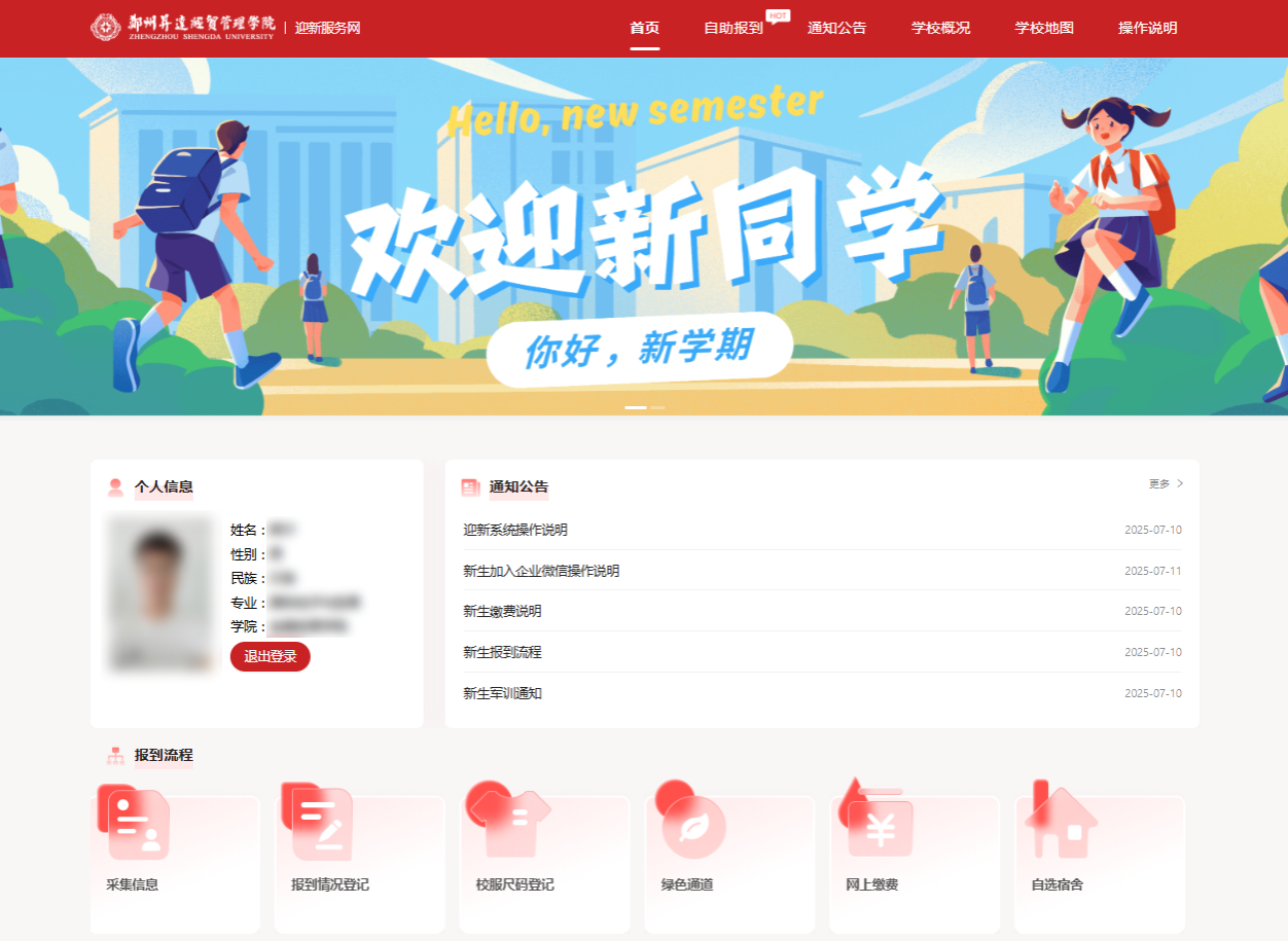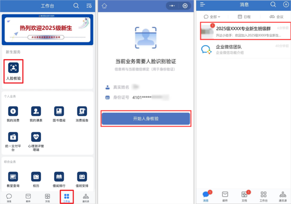 数字迎新分为【网上自助报到】和【现场报到】两个环节。网上自助报到完成信息采集、网上缴费及宿舍选择等;现场报到完成身份验证后入住宿舍。移动端依托企业微信,学校按照班级自动创建【新生班级群】,新生登录企业微信、完成人脸核验后自动进群与辅导员、同学建立联系。请2025级新生尽快加入学校企业微信,来校前完成网上自助报到各环节的办理。