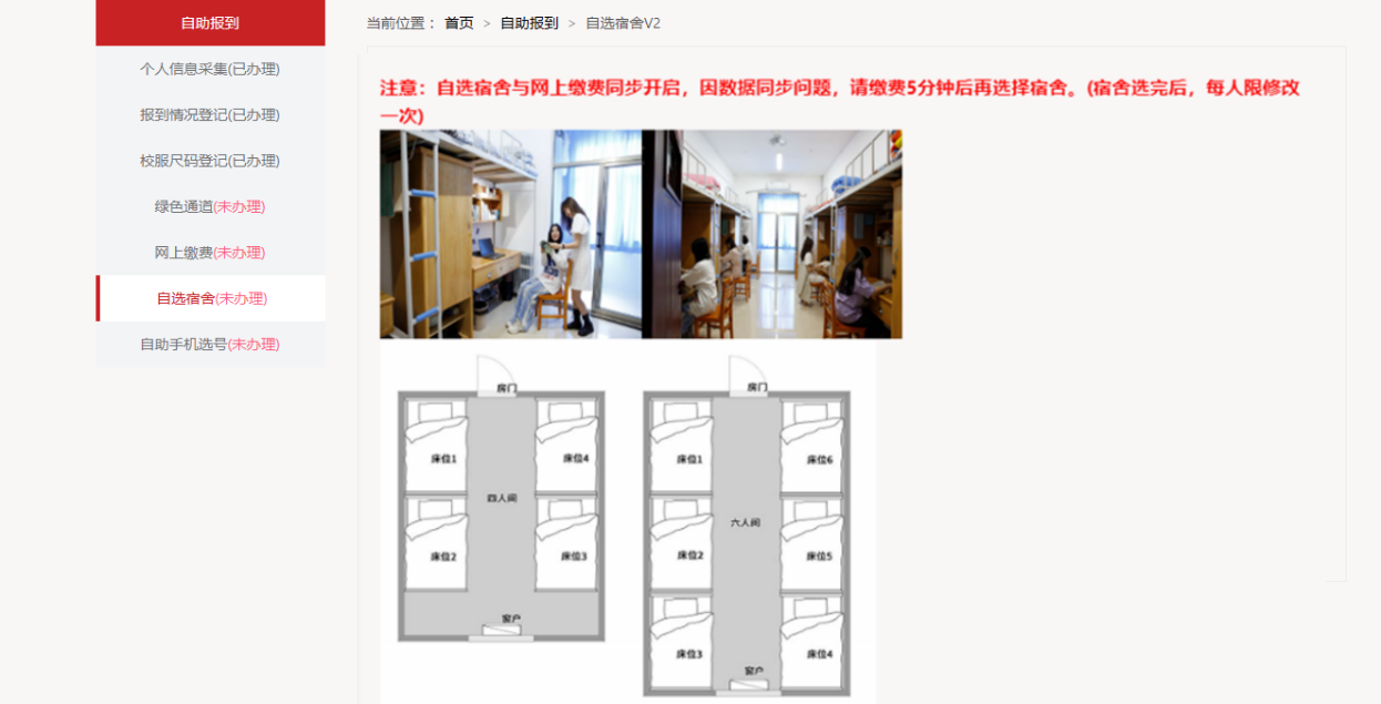6、【自选宿舍】:自选宿舍与网上缴费同步开启,因数据同步问题,请缴费5分钟后再选择宿舍(宿舍选完后,如有空床位可更改选择,每人限修改一次)。新生在选择宿舍时,可查看室友信息。