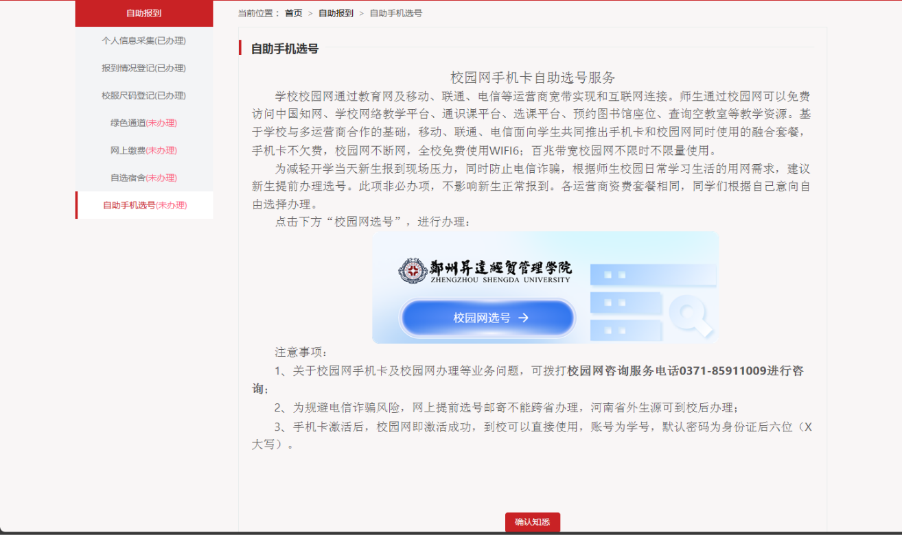 7、【自助手机选号】:为减轻开学当天新生报到现场压力,根据师生校园日常学习生活的用网需求,建议有需求的新生提前在线办理选号。此项非必办项,不影响新生正常报到,同学们可根据各运营商具体的资费标准自由选择办理。