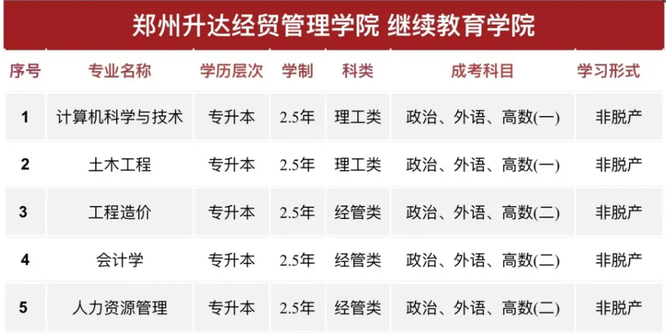 2025年郑州升达经贸管理学院高等学历继续教育招生简章已发布,涵盖多个热门专业。