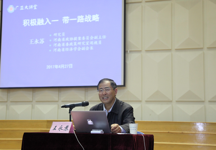 4月27日下午,我院科研处邀请河南省人民政府发展研究中心原主任王永苏研究员在艺术系音乐厅作关于《积极融入一带一路战略》的形势报告。出席报告会的学院领导有:院长郭爱先、院党委书记张德伟,副院长张金安、副院长吴益民,相关部门主管,部分教职员代表和学生代表近500人。报告会由吴益民副院长主持。