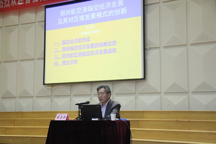 报告会上,张占仓研究员首先指出,郑州航空港区发展规划获得国务院的审批,标志着我国把对全球日益重要的“临空经济”纳入了国家战略。接着从临空经济的特征、郑州临空经济发展的战略优势、郑州航空港临空经济发展成效、理论分析等四个方面,站在独特的视角有理有据地进行分析阐述,娓娓道来,向我们展示了郑州乃至河南临空经济发展的现状和未来。他认为,郑州航空港综合实验区现在是一个客货吞吐量高速增长的国际航空枢纽,未来是一个中国领先的航空大都市,在国际上有重要影响的航空枢纽和临空产业集群。随着郑州国家中心城市设立和航空港综合实验区建设,必然促进郑州国际航空枢纽建设与航空港临空经济的快速发展,“国际郑”会更加引人注目,河南将在全国起到先导的作用。