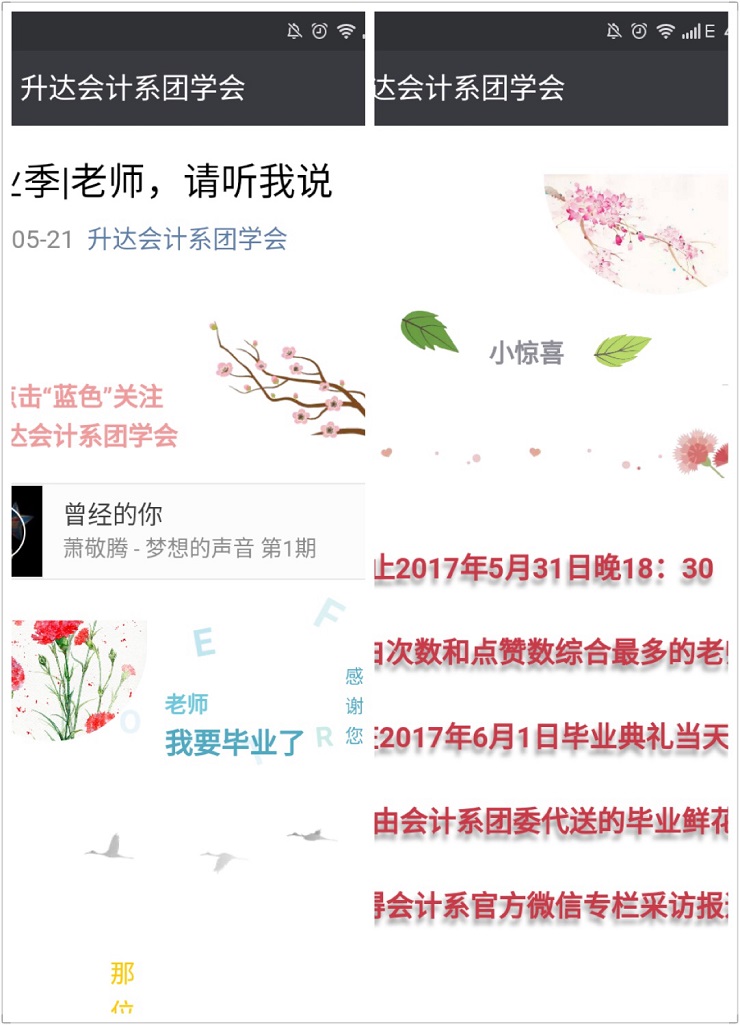 “那位陪我走过整个大学时光的老师,您的学生就要毕业了,恐怕再也不能在您课上睡觉,真的毕业了,却突然想再次把手机交到您背后的手机袋……毕业了,你有什么想对任课老师说呢?”在本次活动中只要是想对辅导员亦或是某位教职工说的话,就可以通过微信在升达会计系团学会上的暖心毕业季文章的最后“留言”给他,活动很快就达到了意想不到的效果,毕业生将他们想说的话都向恩师吐露出来,有感恩、有回忆,也体现了浓浓的师生情意。