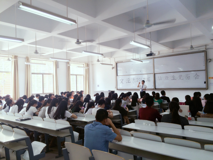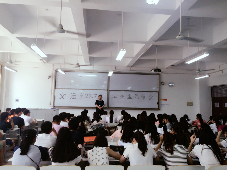 会议伊始,郭老师向全体毕业生介绍参加见面会的领导和老师,并说明本次见面会的目的和意义。首先,段主任发表讲话,他表达了对毕业生的深切祝愿,回顾了2017届毕业生在校期间取得的优异成绩,对本届毕业生在考研、司法考试和团学工作等方面的成绩都给予了充分肯定。同时,段主任寄语毕业生:第一,要坚持学习;第二,要有敬畏之心;第三,要做一个正直的人;第四,要有感恩之心。他希望各位毕业生以后能常回学校看看,母校和文法系始终欢迎大家。接下来,杨书记发表讲话,他在对本届毕业生四年的情况回顾中看到了大家的成长,并希望大家常怀感恩之心,孝敬父母,尊重他人,在自己未来的成长道路上要不满现状,永远向更高一步攀登。最后,曹老师以学姐的身份温暖得传达对师弟师妹的期盼,她谈了自身的感想,围绕“凡事靠自己”五个字提醒大家成长要坚持的信念,表达了对同学们的关心。