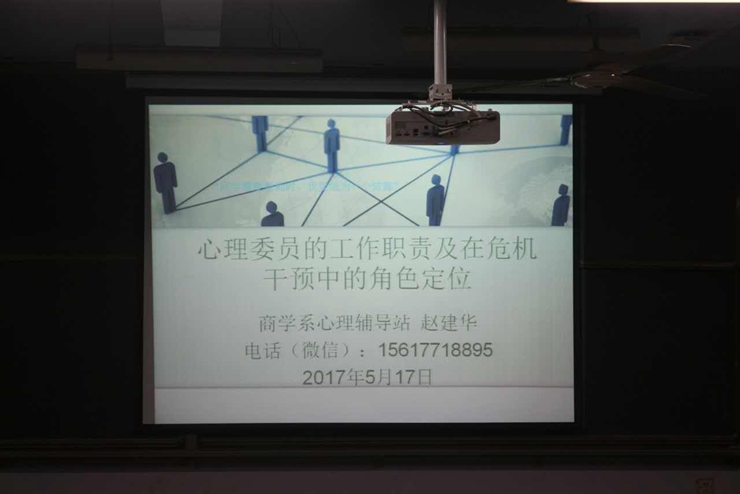 2017年5月17日18时,在四号教学楼108室开展了《心理委员的工作职责及在危机干预中的角色定位》讲座。此次讲座是商学系“525”心理健康月系列活动的第二场活动。